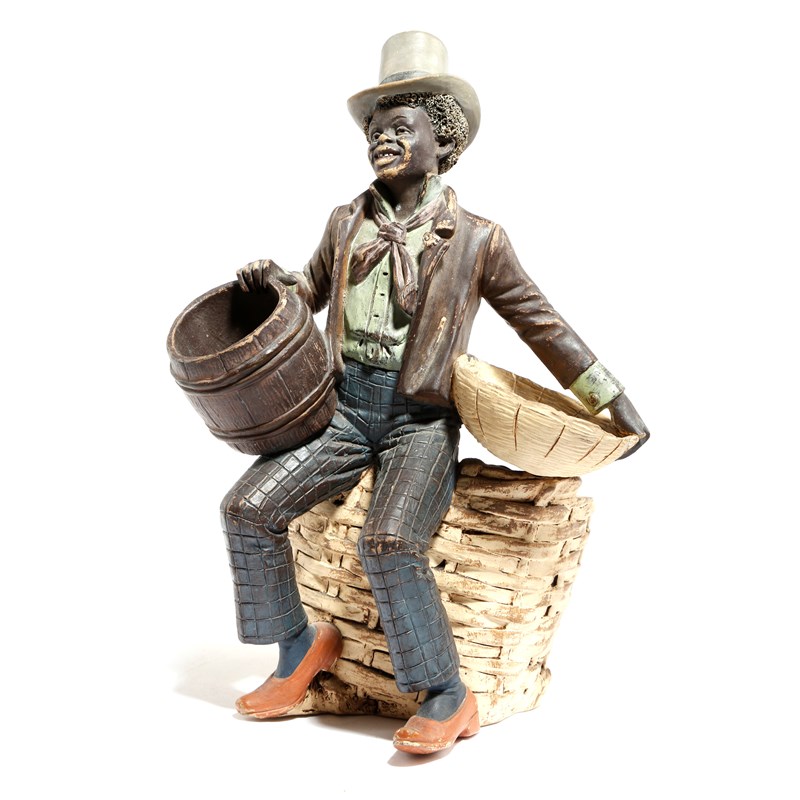 A German polychrome painted terracotta figure of an Afro-Caribbean American gentleman, wearing a top hat, seated on a basket holding a barrel and a bowl, impressed marks 'BB 5504', late 19th / early 20th century, 25.9cm high.