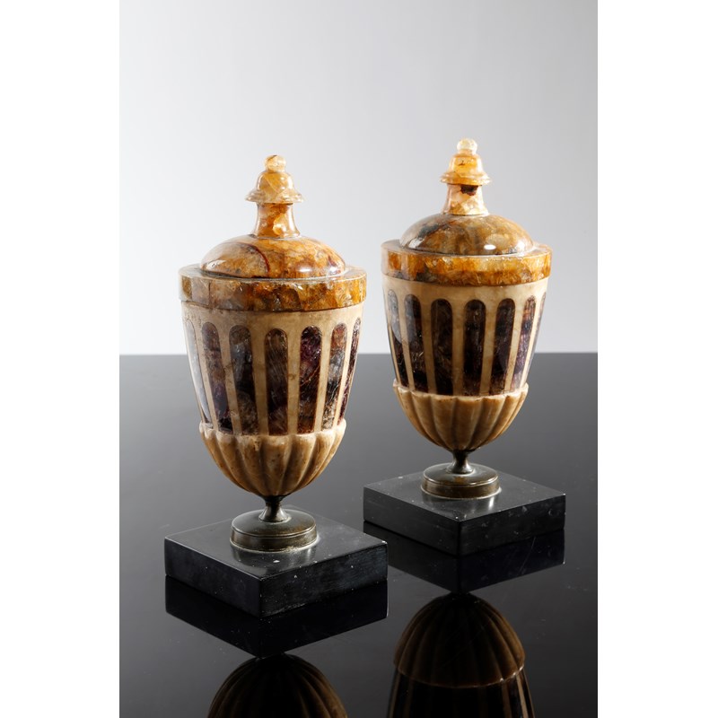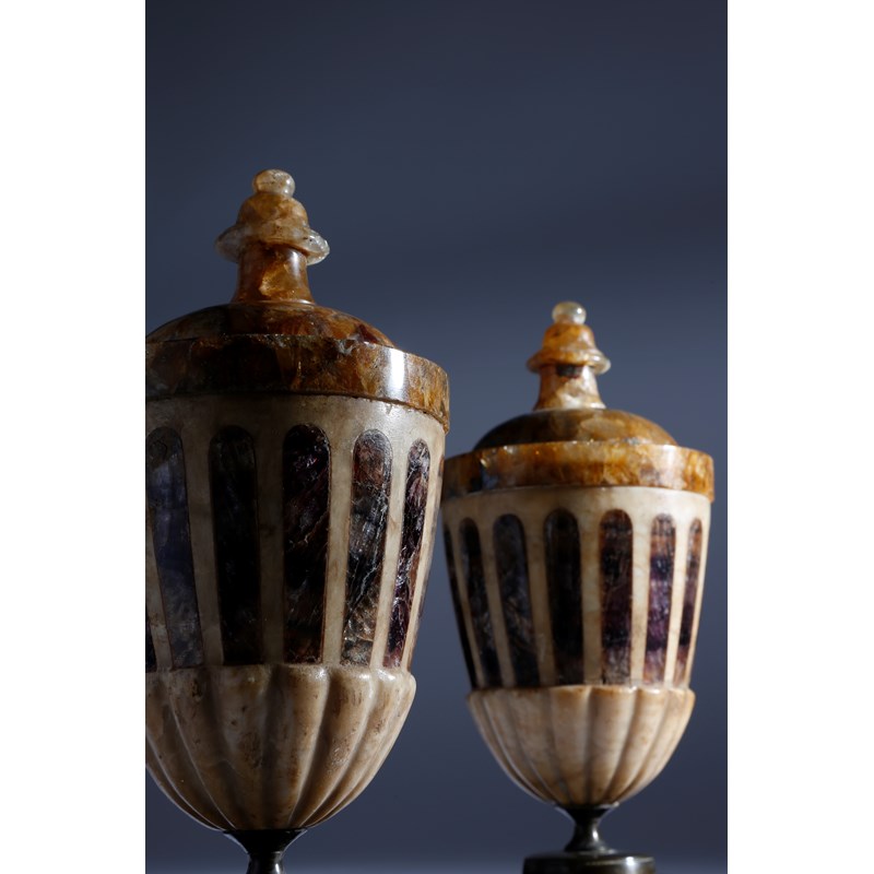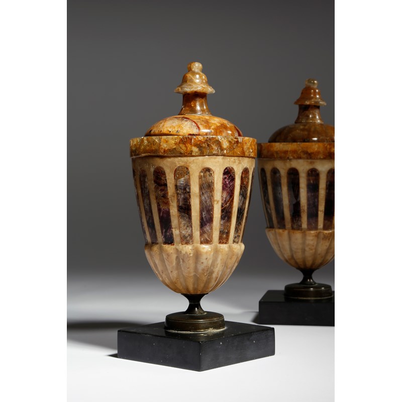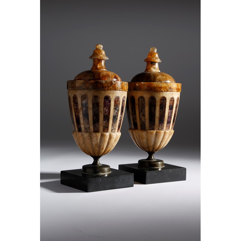 A pair of early 19th century Derbyshire blue john urns, each with a turned finial, above an alabaster gadrooned body inlaid with blue john fluting, on a bronze foot and an Ashford black marble plinth base, 23.6cm high. (2)