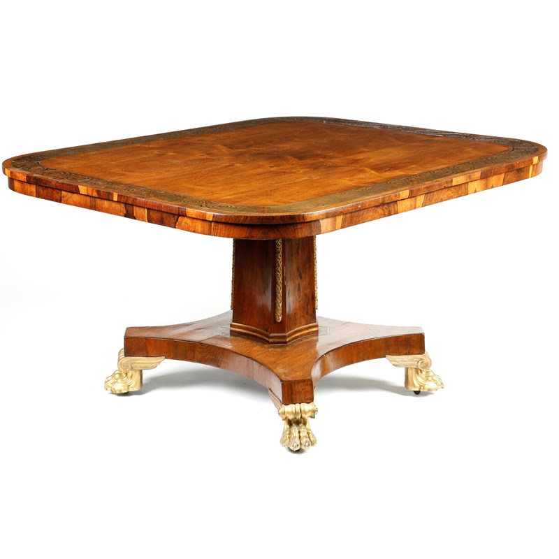 λ A Regency rosewood and brass mounted centre table, the tilt-top inlaid with a band of marquetry decorated with scrolling leaves and palmettes, on a concave stem applied with bands of laurel leaves, with a platform base and gilt bronze scrolled and winged lion's paw feet and castors, 77.8cm high, 116 x 148cm.