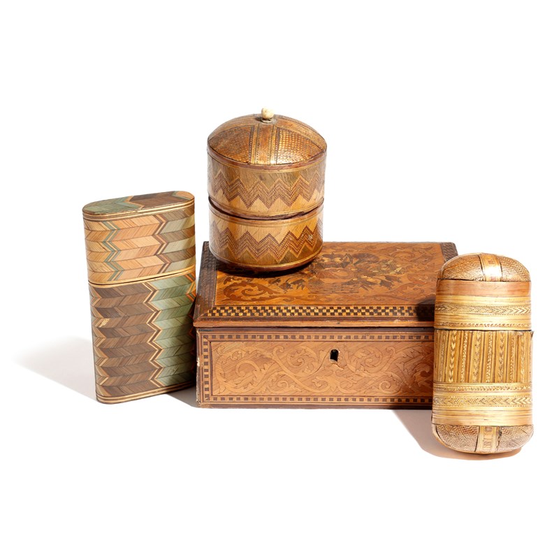 A 19th century French straw-work box, the hinged lid with a chequer band and inlaid with a basket of flowers, the interior decorated with musical trophies and a lyre, together with two straw-work cigar cases and a cylindrical box and cover with a bone finial, 16.8cm (max). (4)