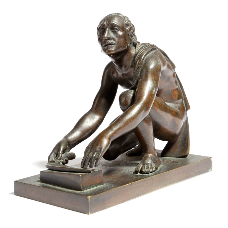 After the antique. A late 19th century Grand Tour bronze of Arrotino the Scythian knife sharpener, the base with a foundry pastille, inscribed 'F. P. SANSON SUCC. HAMBURG, 4 NEUERWALL', 13.8cm wide.