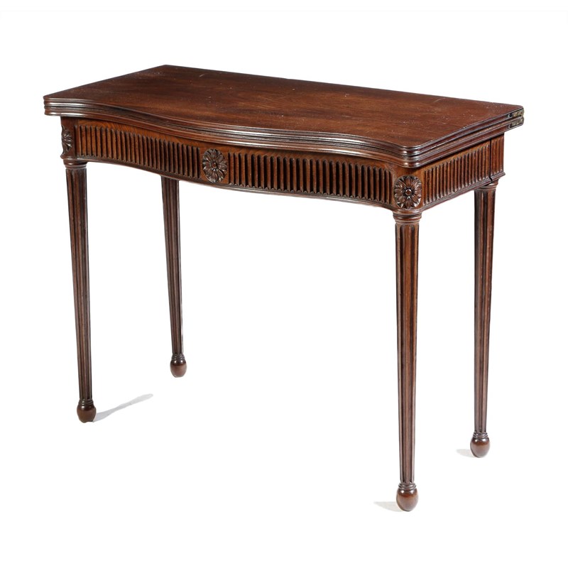 A George III mahogany serpentine front card table, the fold-over top on twin gate supports, above a fluted frieze and carved flower head rondels, on fluted tapering legs and turned feet, 71.6cm high, 90.8cm wide, 43.8cm deep.