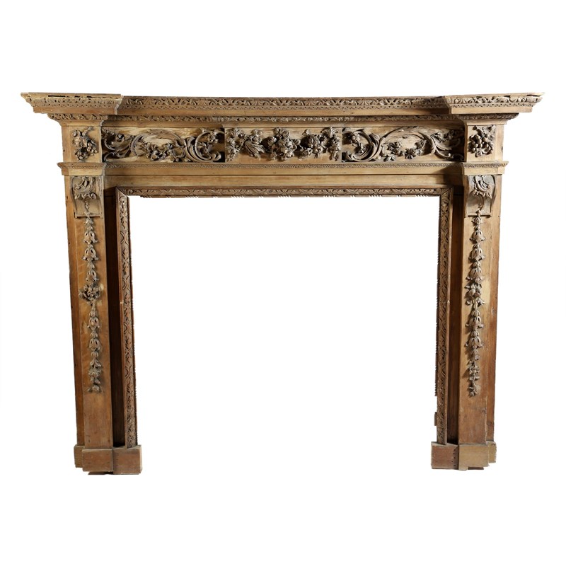 A George III carved pine chimney-piece, with a carved inverted breakfront mantel, above a frieze decorated with scrolling acanthus and swags of flowers, fruit, nuts and berries, above a pair of scroll corbels and carved chains of husks, external: 155.6 x 198.6cm, internal: 115.5 x 124.8cm.