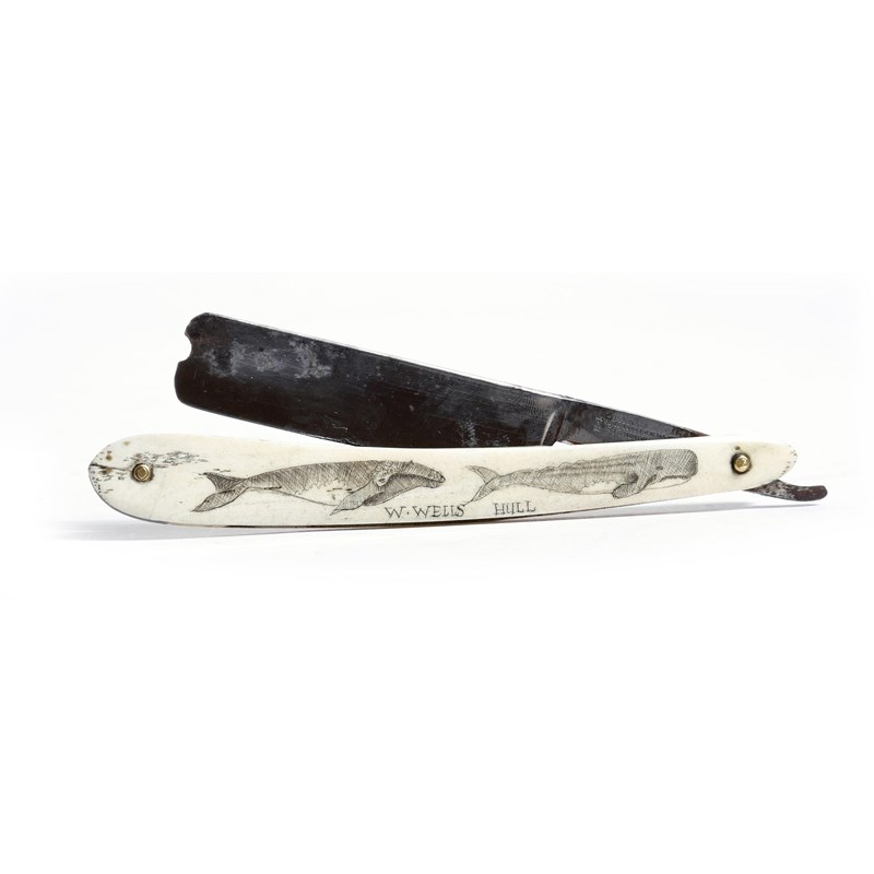 A 19th century whaler's scrimshaw bone and steel cut throat razor, worked on one side with a grey whale (Eschrichtius robustus), a sperm whale (Physeter macrocephalus), a compass and inscribed 'W. WELLS HULL', the verso with a whaling scene with a whale being harpooned, the blade inscribed 'JOSEPH RODGERS & SON CUTLERS TO THEIR MAJESTIES NO. 6 NORFOLK STREET SHEFFIELD', 15cm long.