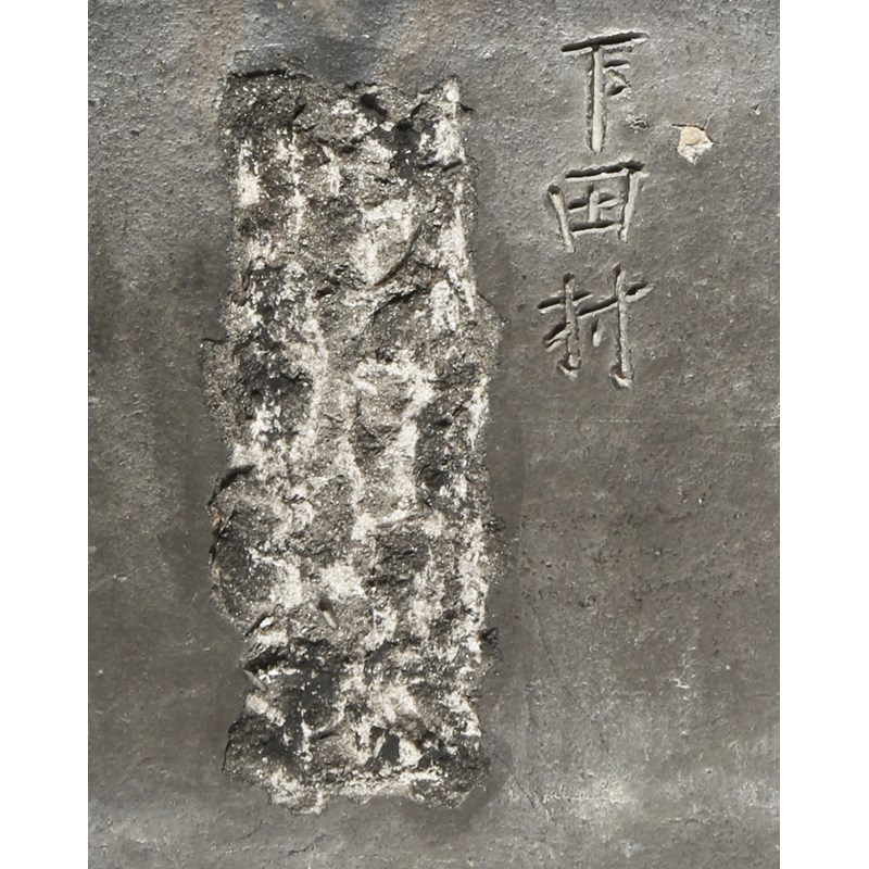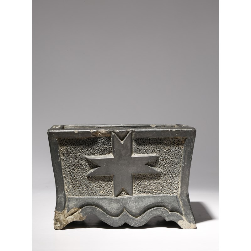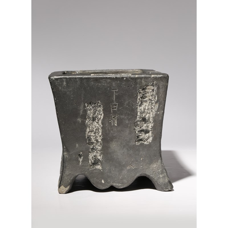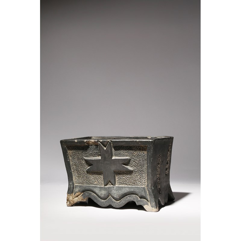 The rectangular stoneware body raised on four short feet, the lower section with a scrolling border and with a large eight-pointed cross to the front, the mon of the Nose family, the sides and back with a three character inscription referring to the village of Shitadamura, 16.5cm x 17cm x 24.2cm.