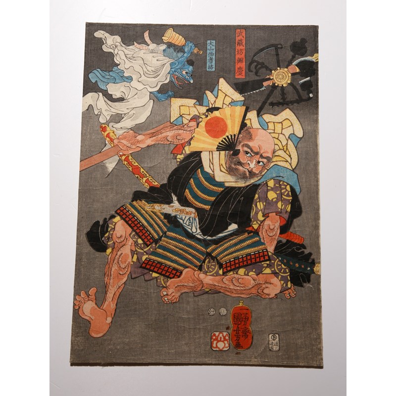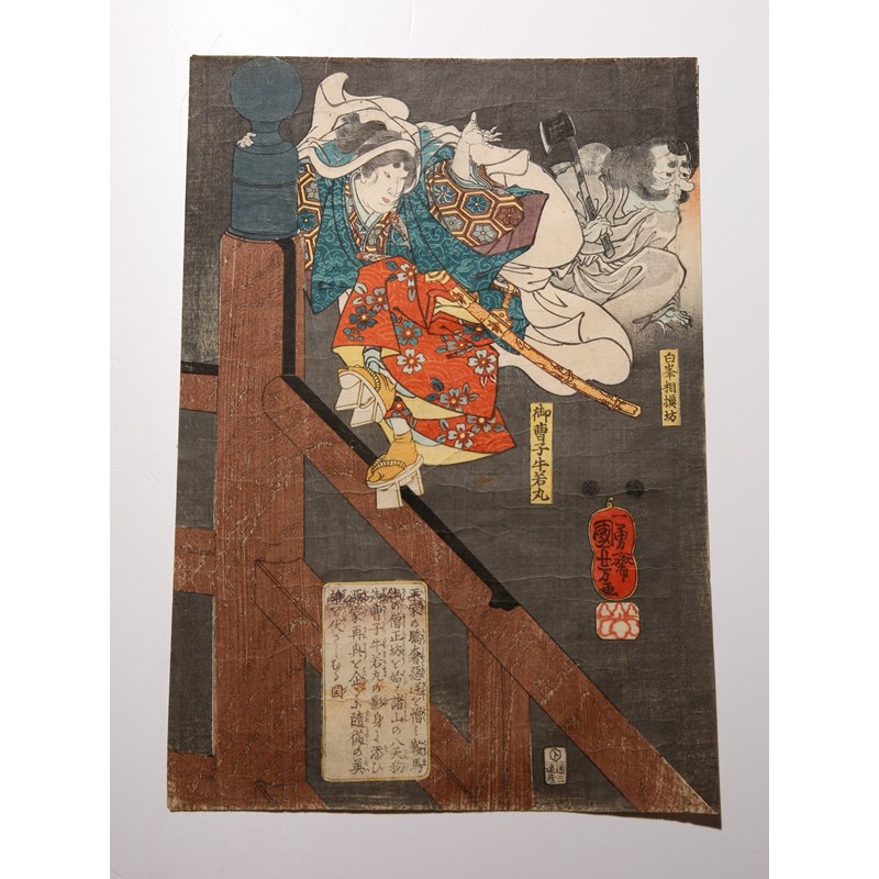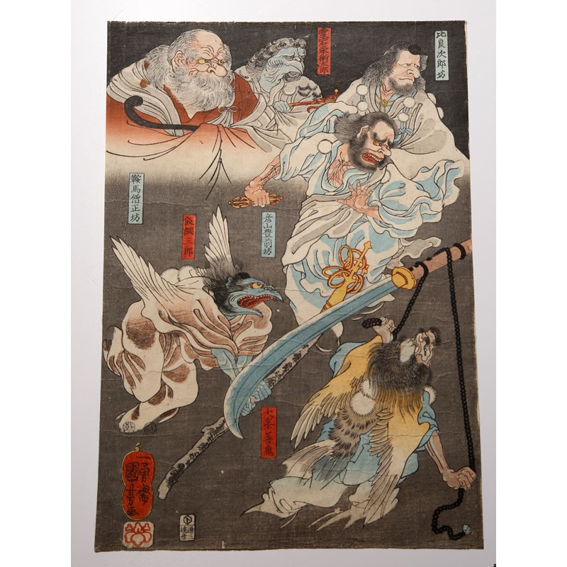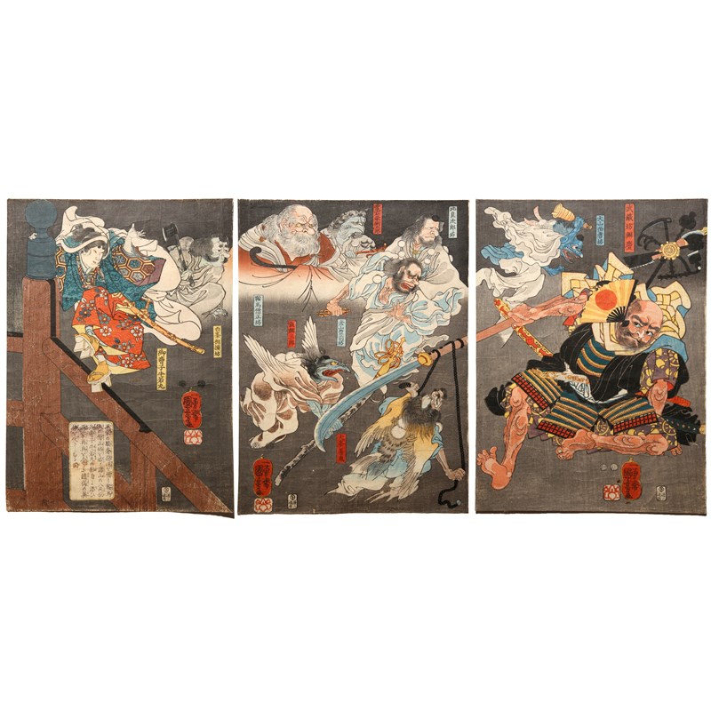 A Japanese woodblock print triptych entitled Heike no kyoshaku akugaku (Minamoto Yoshitsune fights Benkei on Gojo Bridge with the help of tengu demons), published by Enshuya Hikobei, with censors' seals Mera and Murata, signed Ichiyusai Kuniyoshi ga, oban tate-e,each approximately 36cm x 25cm. (3)
