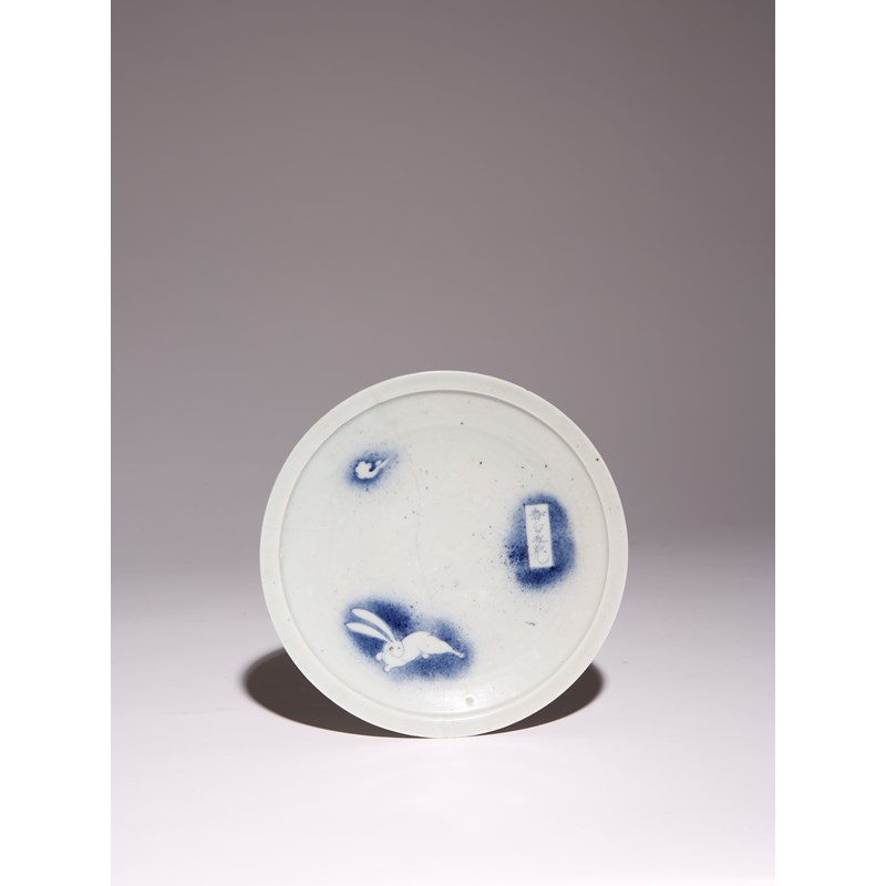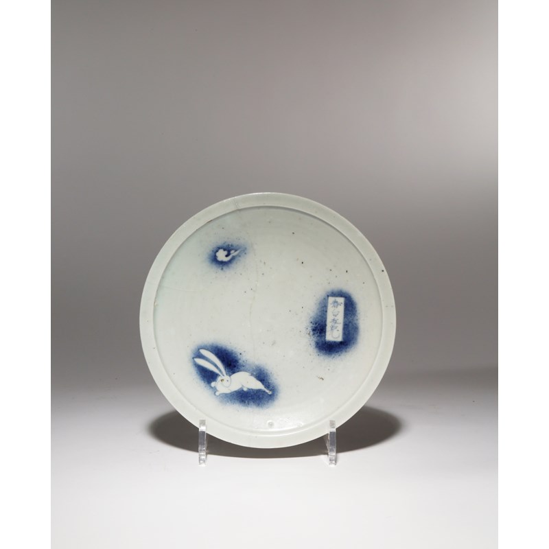 This dish is an example of early porcelain produced at the Tengudani kiln in Arita. The original design was Chinese; the hare is often represented pounding the elixir of life.