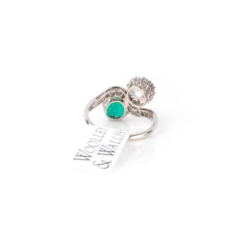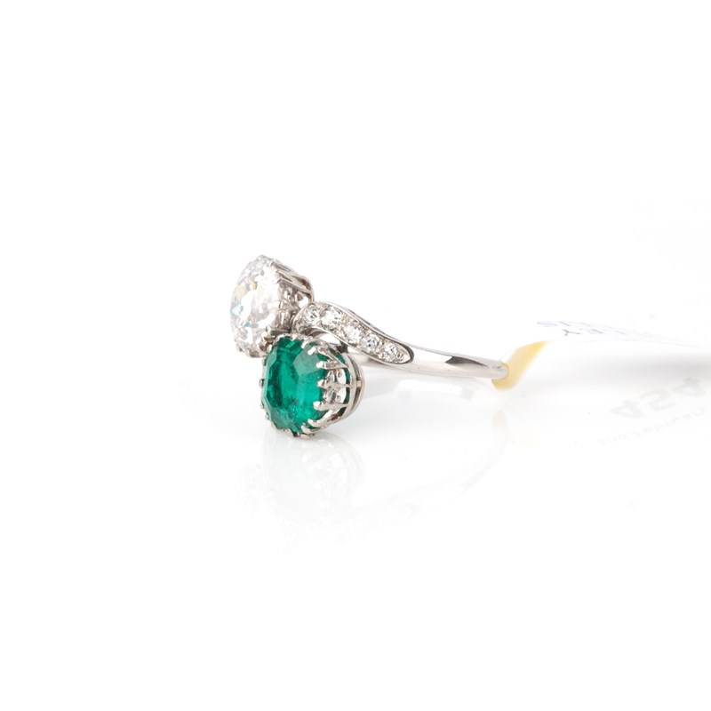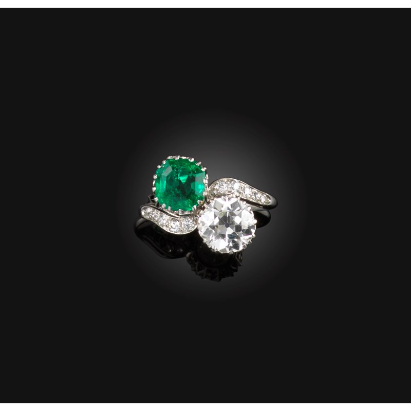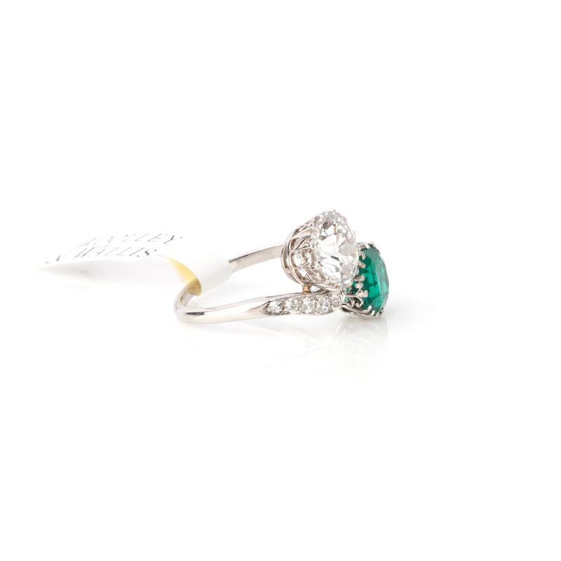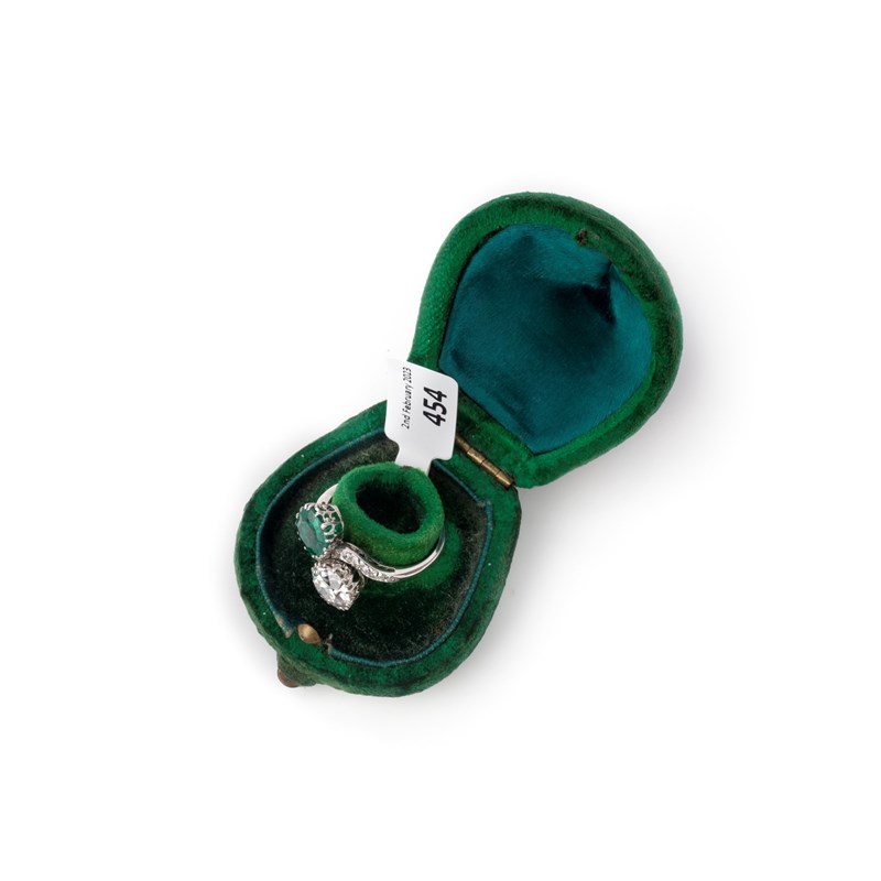 An emerald and diamond ring, early 20th century, of toi et moi design, set with a circular-cut diamond weighing approximately 1.50 carats, and a step-cut emerald weighing approximately 1.40 carats, to sinuously curved shoulders set with smaller circular-cut diamonds, mounted in platinum, size L, case