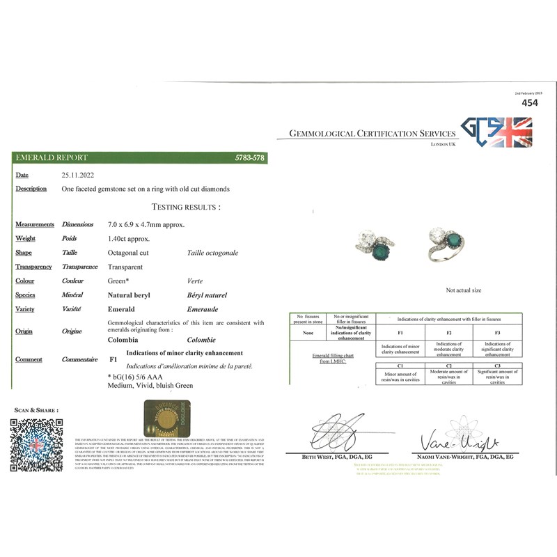 Accompanied by GCS report no. 5783-578, stating that the emerald weighing approximately 1.40 carats is of Colombian origin, with indications of minor clarity enhancement