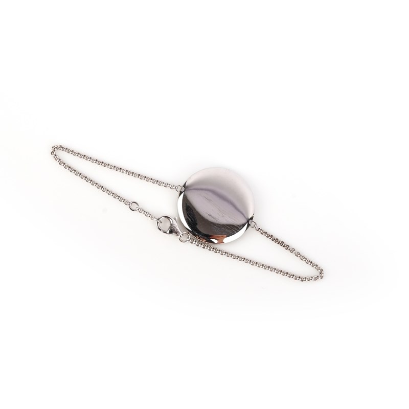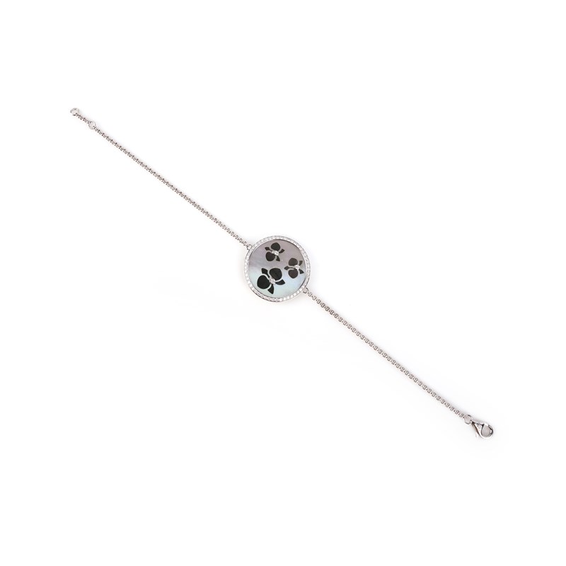 Cartier, a mother of pearl and diamond bracelet, 'Caresse d'Orchidées', the centre set with a disc of inlaid mother of pearl marquetry depicting stylised orchids, inset and bordered with brilliant-cut diamonds, mounted in white gold, to a white gold chain, length 16.5cm, signed Cartier, numbered SY9167, Italian maker's mark, stamped 750