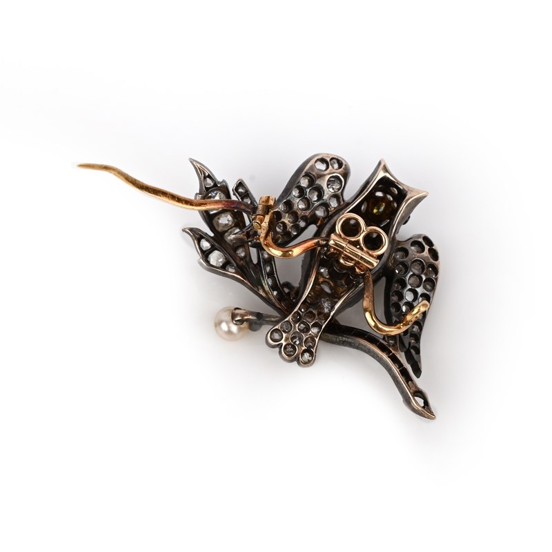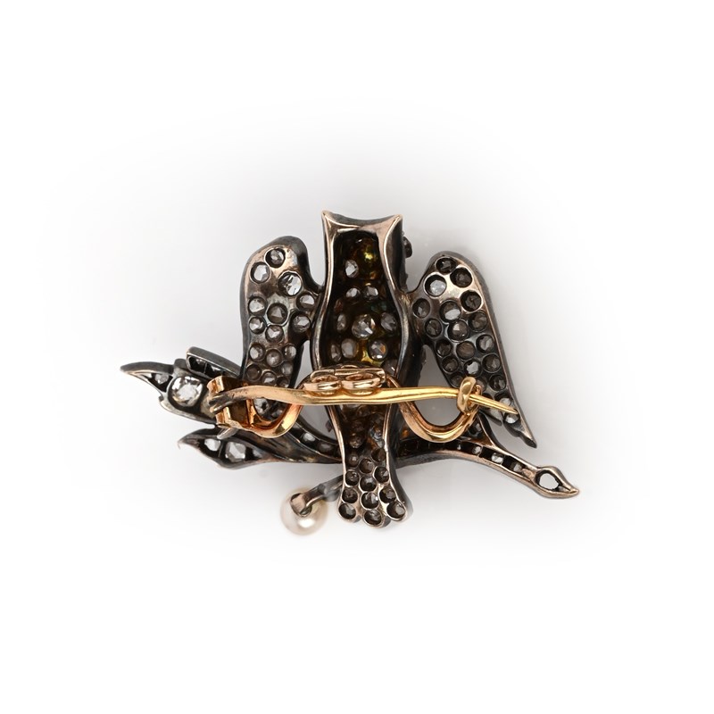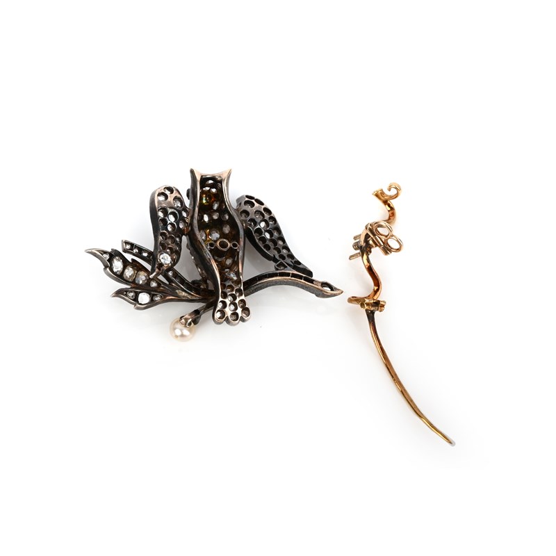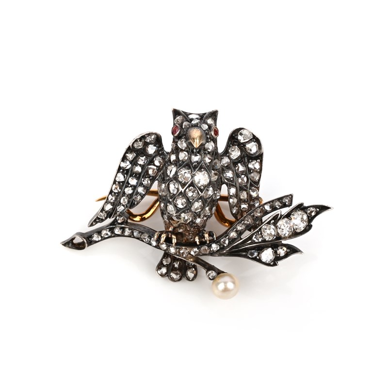A diamond and pearl brooch, designed as an owl on a branch, set with cushion-shaped and rose-cut diamonds, its eyes set with cabochon rubies, the end of the branch set with a pearl, meausuring 4.5 x 3.0cm, one diamond deficient, pearl untested, one eye replaced