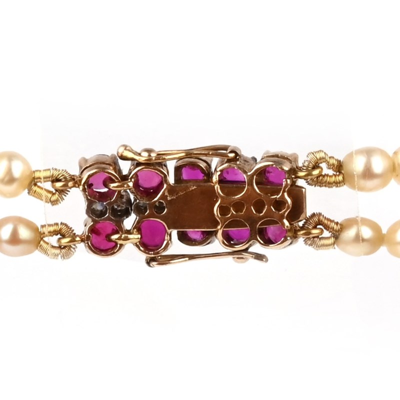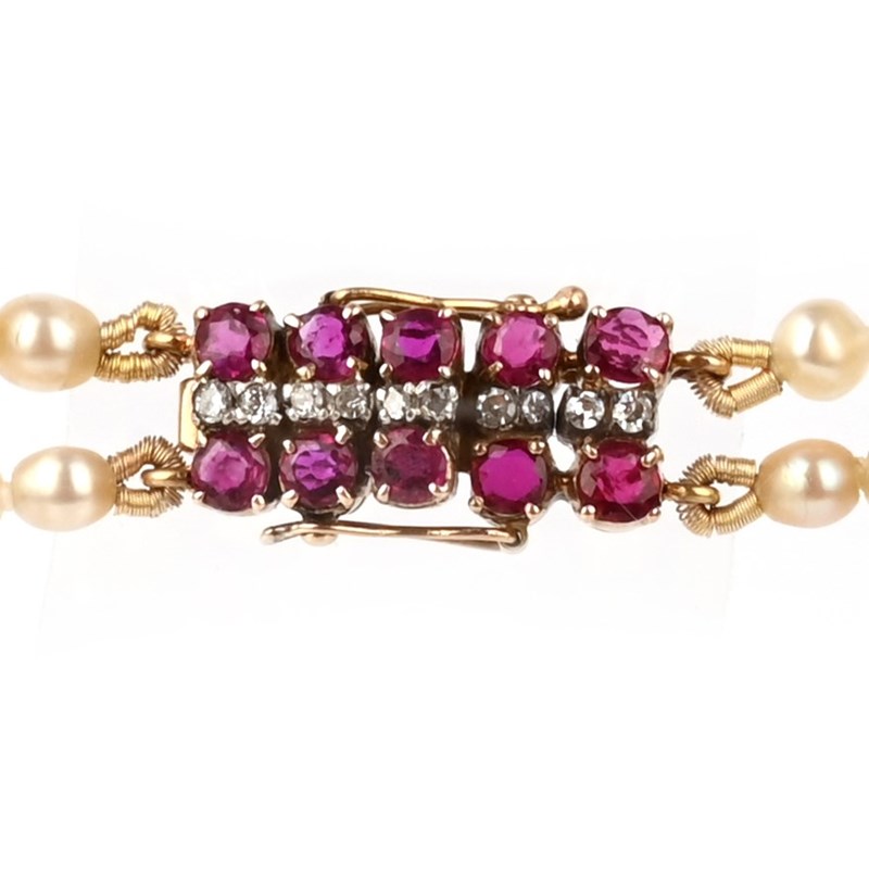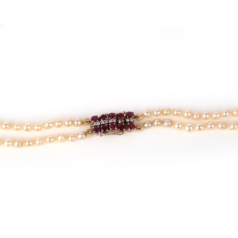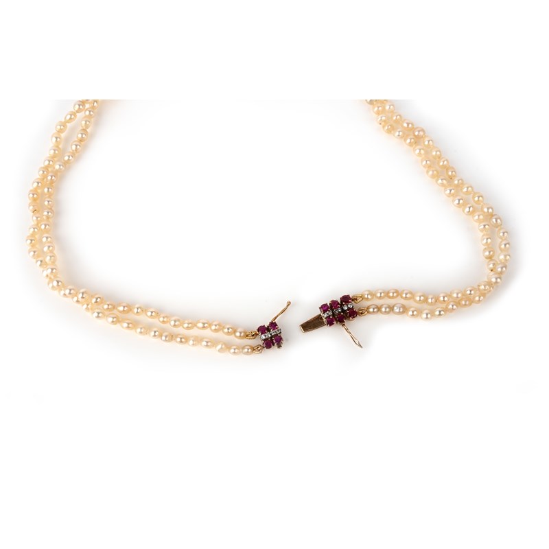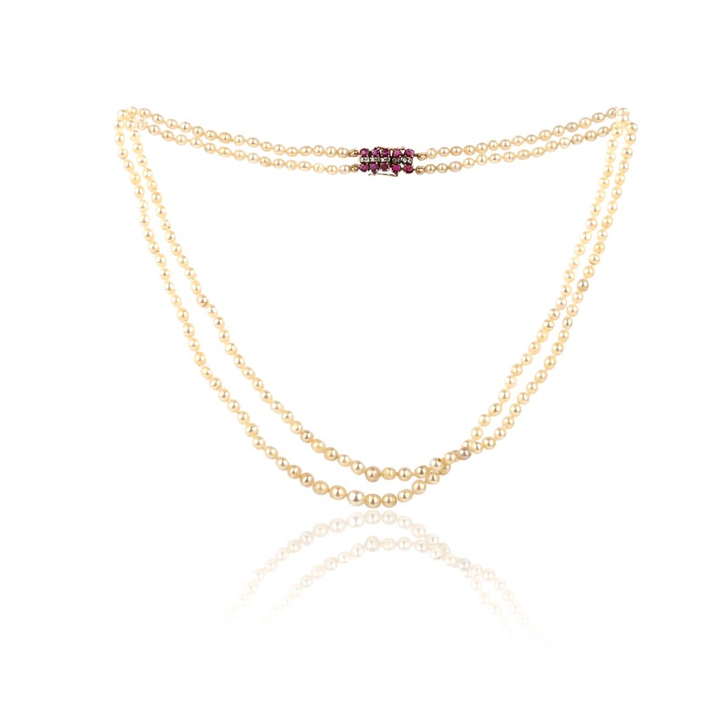 A natural pearl, ruby and diamond necklace, composed of a double strand of natural pearls measuring 3.2-5.1mm, to a clasp set with circular-cut rubies and single-cut diamonds, length 45cm