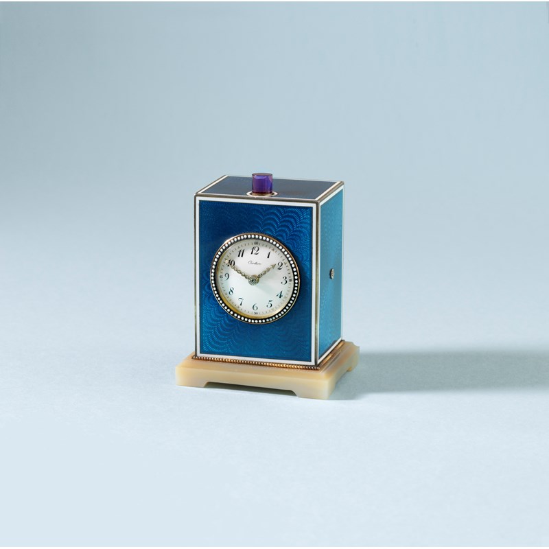Cf. Cartier 1899-1949: Le Parcours d'un Style, Calouste Gulbenkian Foundation, 2007, p.96, no.18, for a closely related clock in the Cartier collection, no. CR01A10, in pink enamel on a darker chalcedony foot, dated 1910.