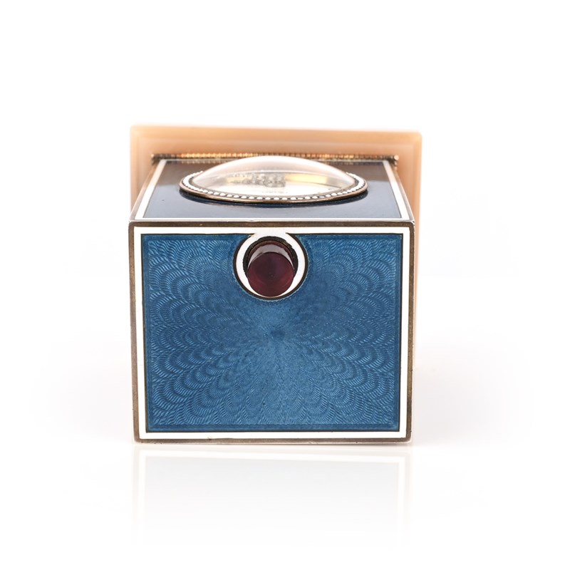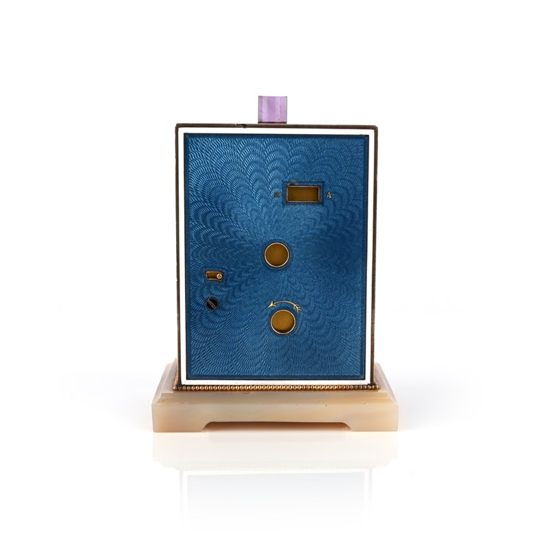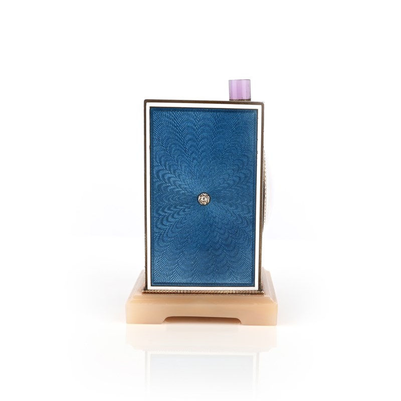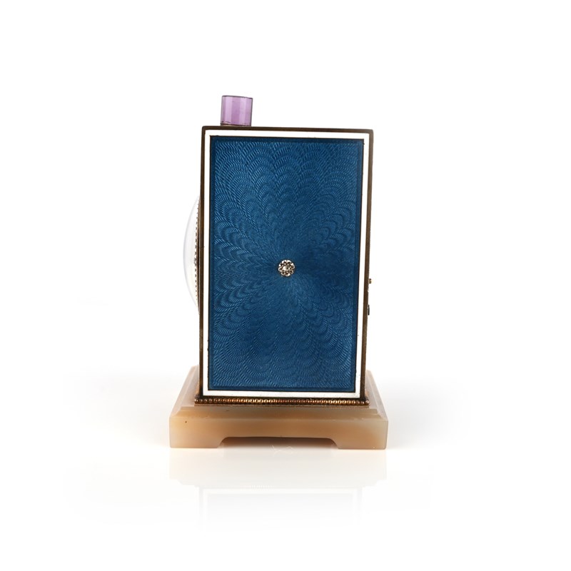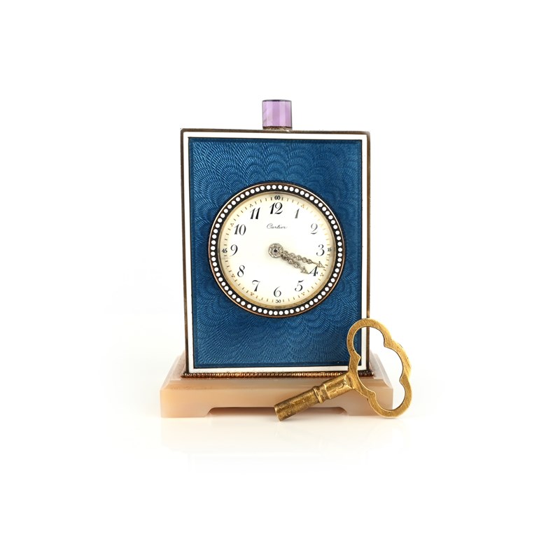 Cartier, a rare Belle Epoque amethyst, enamel, chalcedony and diamond minute repeat desk clock, circa 1910, the circular white-enamelled dial with black enamel indicators and rose-cut diamond hands, within a white enamelled frame, to a cuboid case applied with blue guilloché enamel bordered with white enamel, the top with a cylindrical amethyst push piece, on a four-footed chalcedony base, the sides additionally accented with rose-cut diamonds, measuring 8.0 x 5.8 x 4.9cm including amethyst push piece, dial signed Cartier, indistinct assay and maker's marks, winding key, original fitted case stamped Cartier Paris