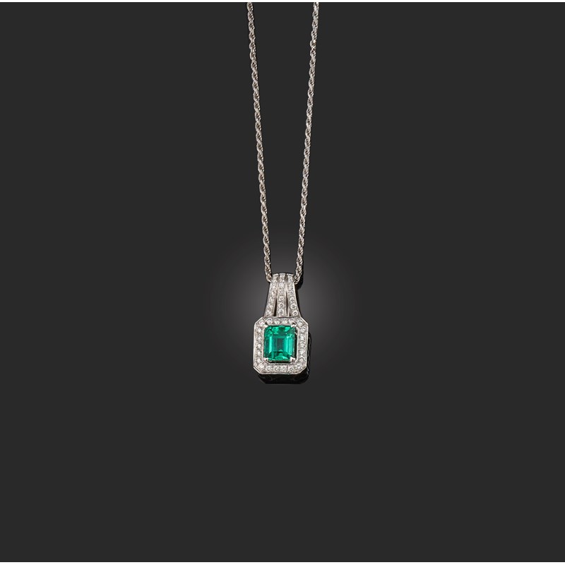 Amoro, an emerald and diamond cluster pendant, the step-cut emerald set within a surround of