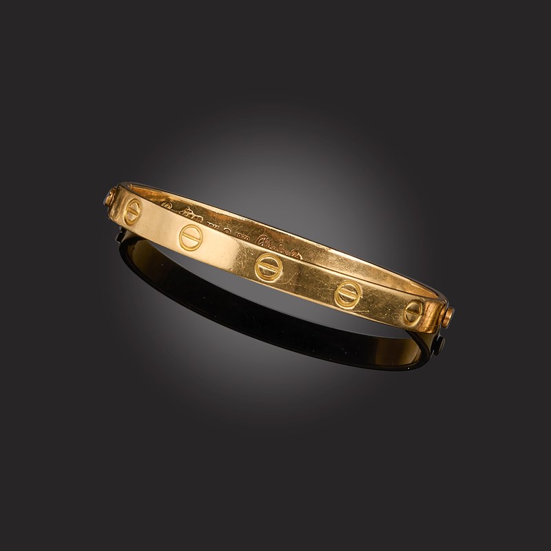 Aldo Cipullo for Cartier, a gold 'LOVE' bangle, circa 1970, designed as a manacle, fastened at each end with a screw, decorated with screw motifs, inner circumference 16cm, signed Aldo Cipullo and Cartier, stamped 18K, copyright mark, date 1970, base metal screwdriver