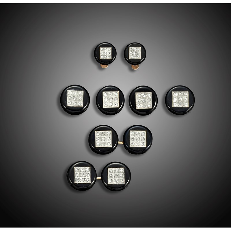 A cased set of Art Deco diamond and black enamel gold dress cufflinks and studs by Cartier
