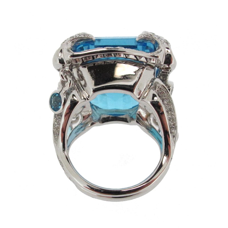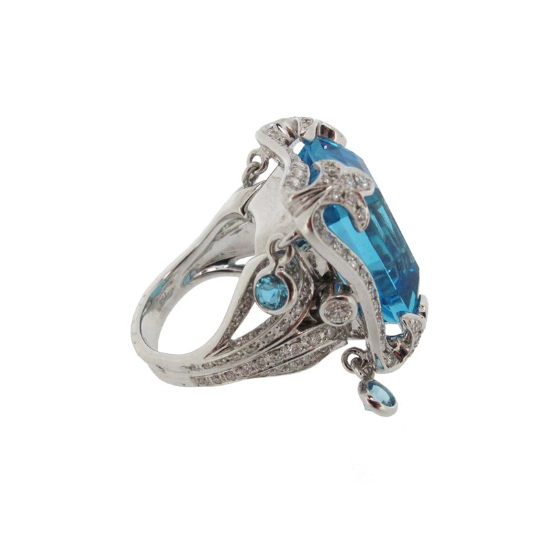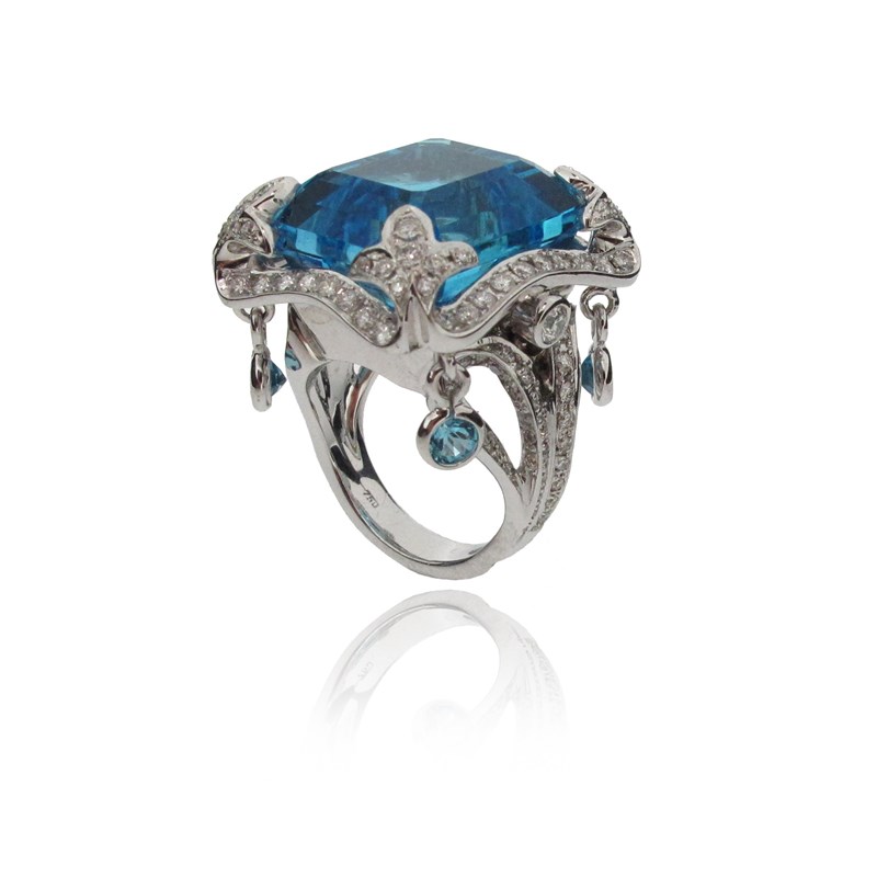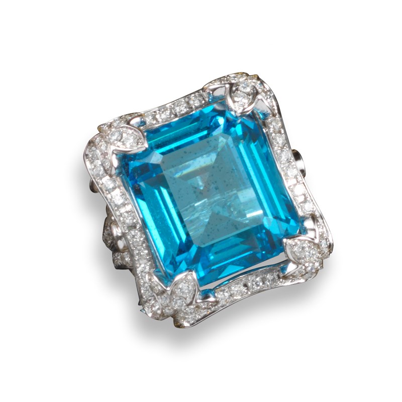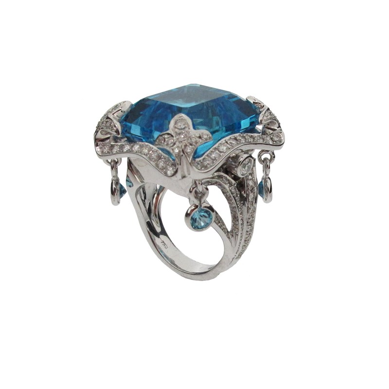 A blue topaz and diamond ring, the step-cut blue topaz is set in ornate diamond-set mount with fleur-de-lys claws, each corner suspending a spectacle mounted circular blue topaz in white gold (one missing), French control marks and signed E Nahum to inner shank, size L 1/2, case
