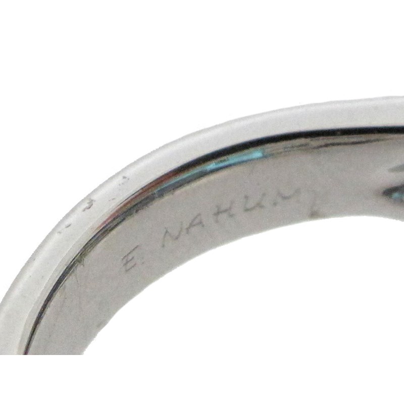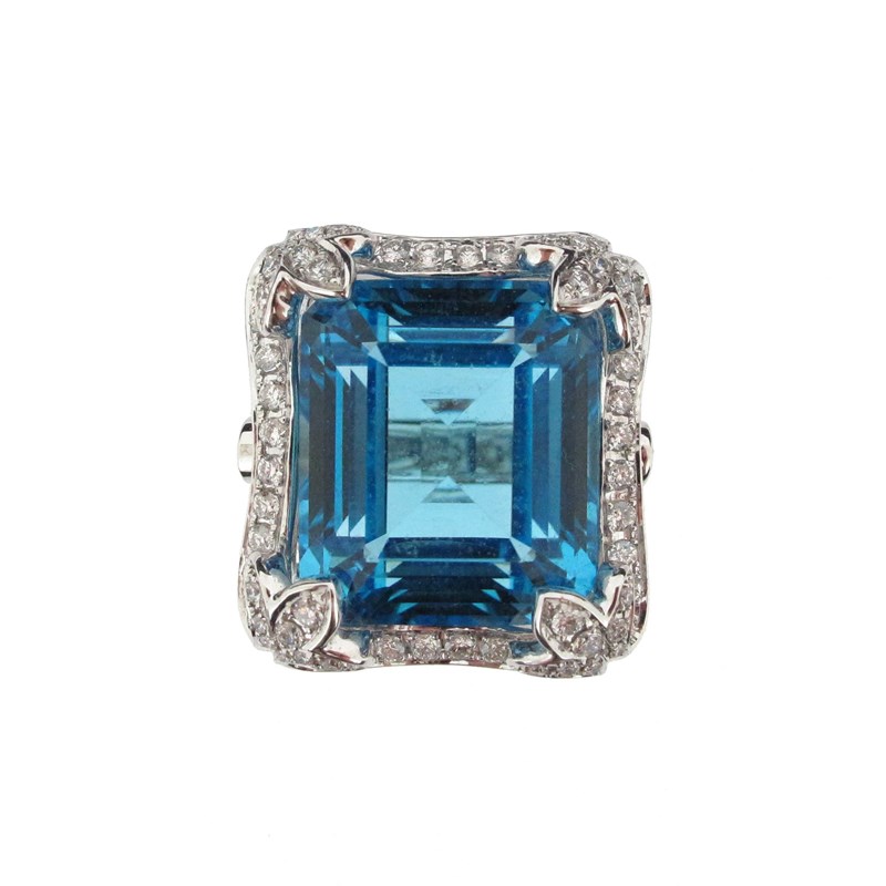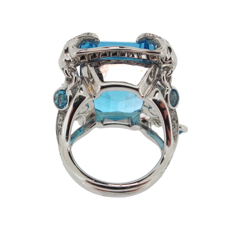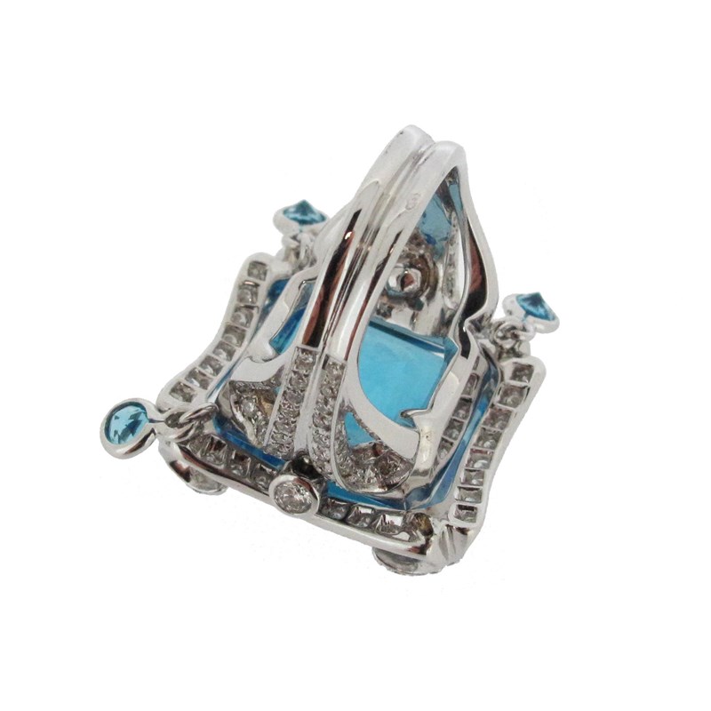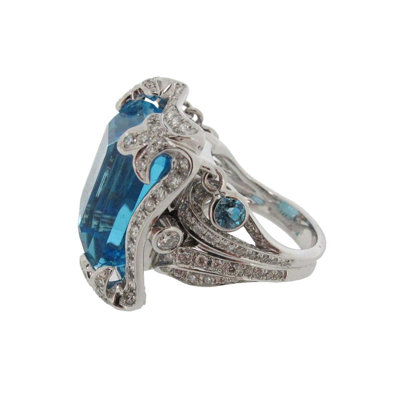 A blue topaz and diamond ring, the step-cut blue topaz is set in ornate diamond-set mount with fleur-de-lys claws, each corner suspending a spectacle mounted circular blue topaz in white gold (one missing), French control marks and signed E Nahum to inner shank, size L 1/2, case