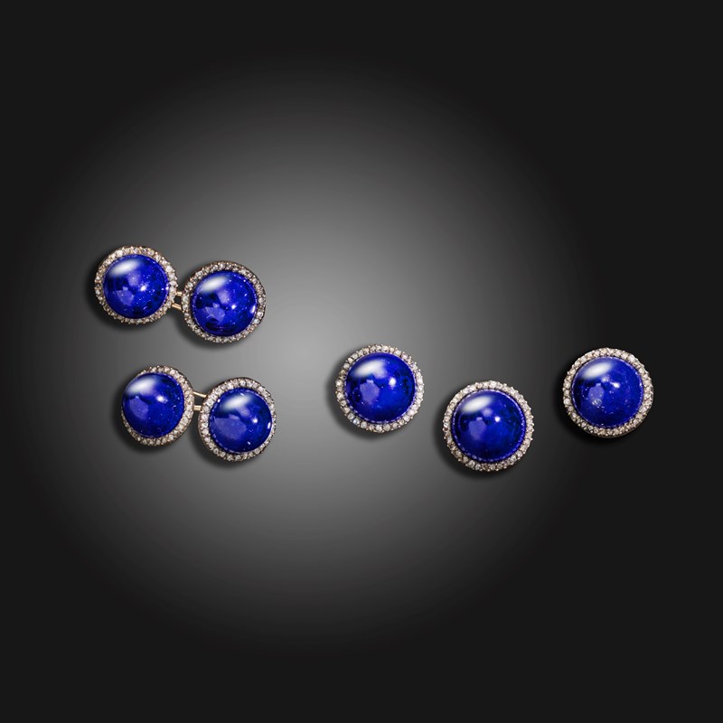 A cased set of French lapis lazuli cufflinks and studs, the cufflinks and three larger studs each centred with a lapis lazuli cabochon within a surround if rose-cut diamonds in gold, French control marks, fitted case by Garrard, 24 Albemarle Street, containing the backings for the three studs, studs 1.2cm wide