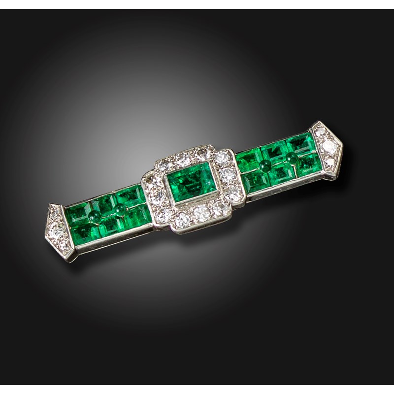 An Art Deco emerald and diamond brooch by Cartier, set with a rectangular emerald within tapered diamond border and six futher emeralds to each side separated with emerald beads and with diamond terminals in platinum, signed Cartier London, 3.7cm wide