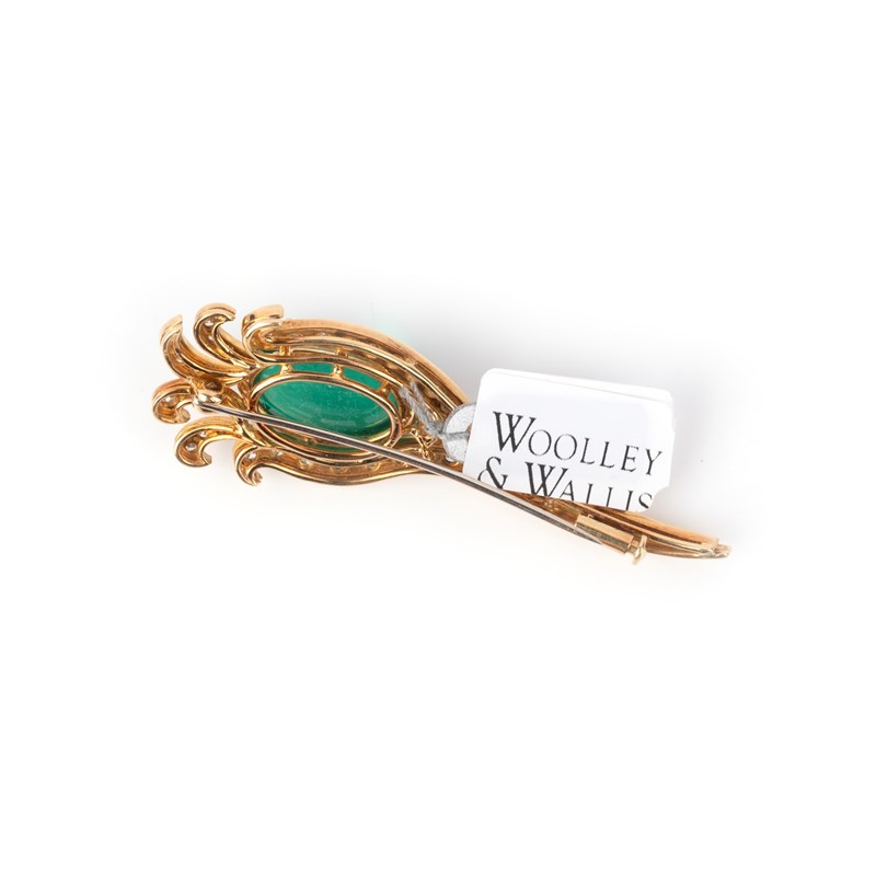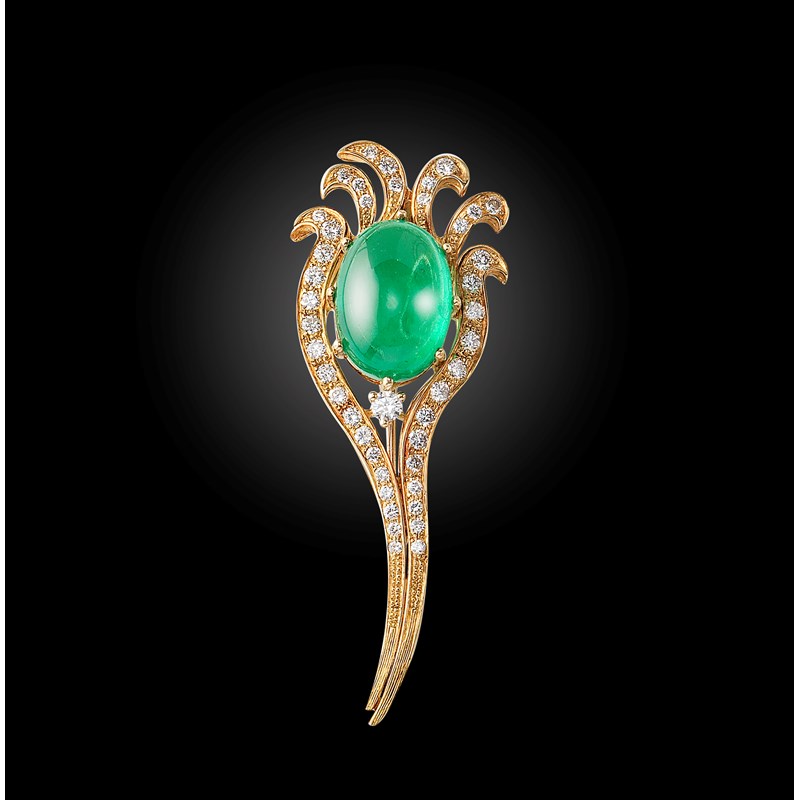 A cabochon emerald and diamond brooch, designed as a stylised peacock feather set with an oval cabochon emerald within diamond border in yellow gold, length 6cm