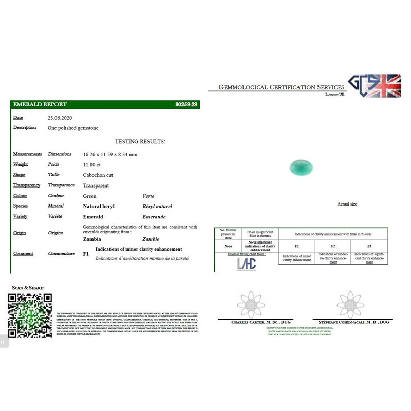 Accompanied by report number 80259-29 from GCS dated 25th July 2020 stating that the natural emerald is Zambian indications of minor clarity enhancement