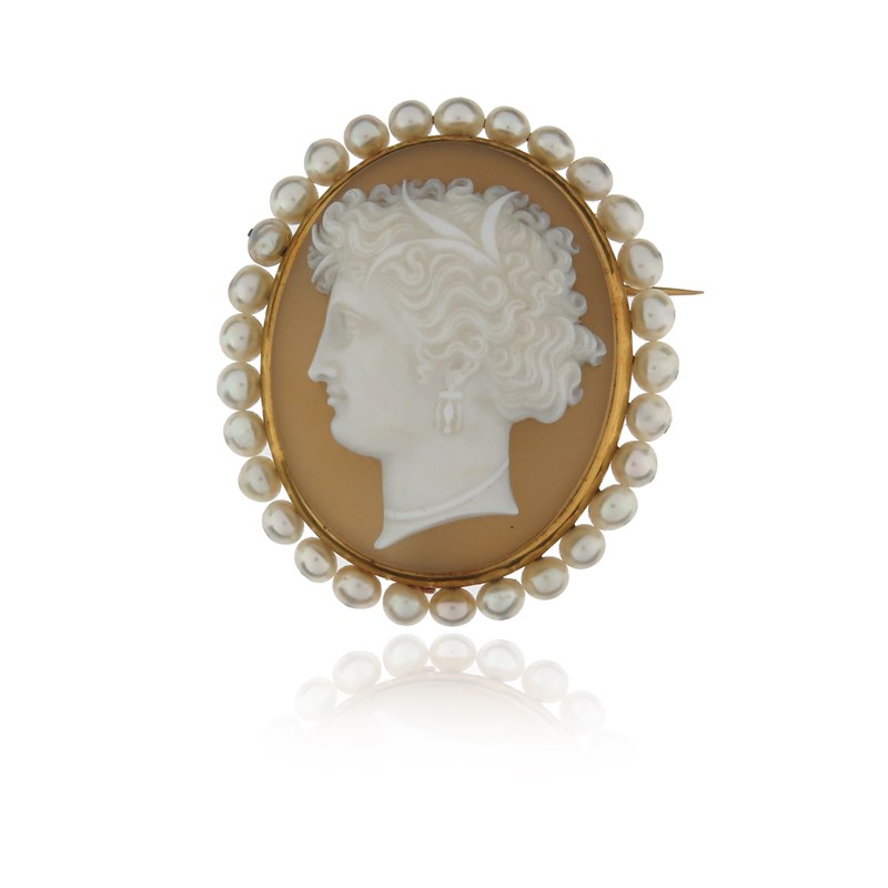A 19th century agate cameo brooch pendant by Paul Lebas, depicting the nymph Arethusa, set in gold within a border of pearls, the cameo signed PL to the neck, 4.8cm high