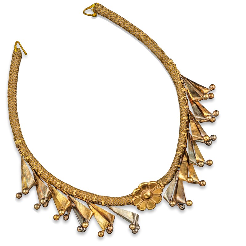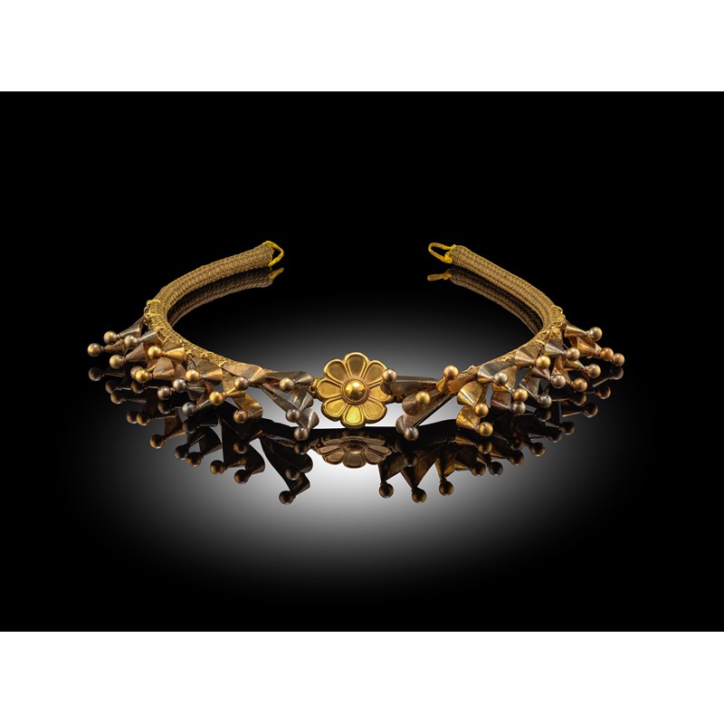 An Archaeological Revival gold and silver tiara by Castellani, c1860, the tubular band of silver threads fitted with a central repoussé flower flanked by a series of gold ornaments styled as laurel leaves and berries, signed with interlaced C's, 33cm long, 3cm high