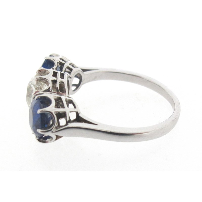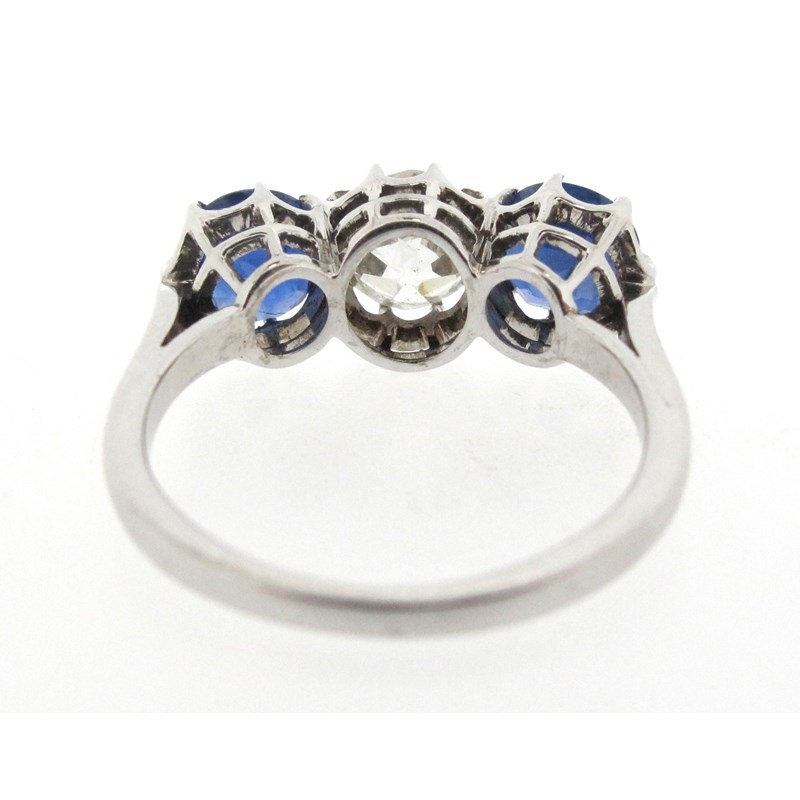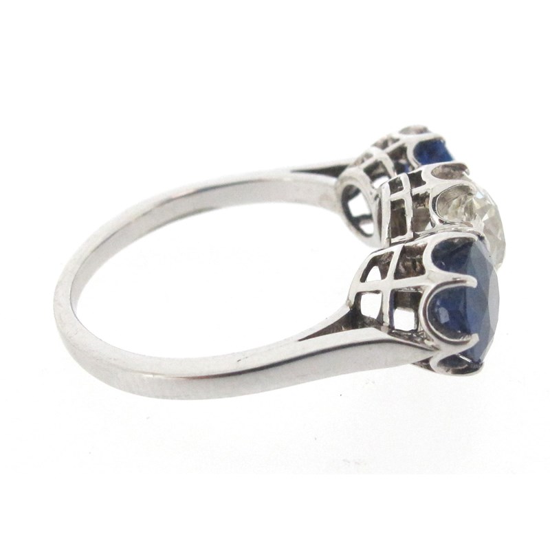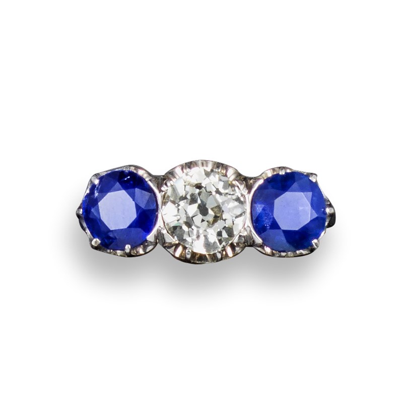 A sapphire and diamond three-stone ring, the old circular-cut diamond weighs approximately 1.08cts and is set either side with a circular-cut sapphire, each weighing 0.97 and 1.08cts each, in platinum, size L 1/2, cased