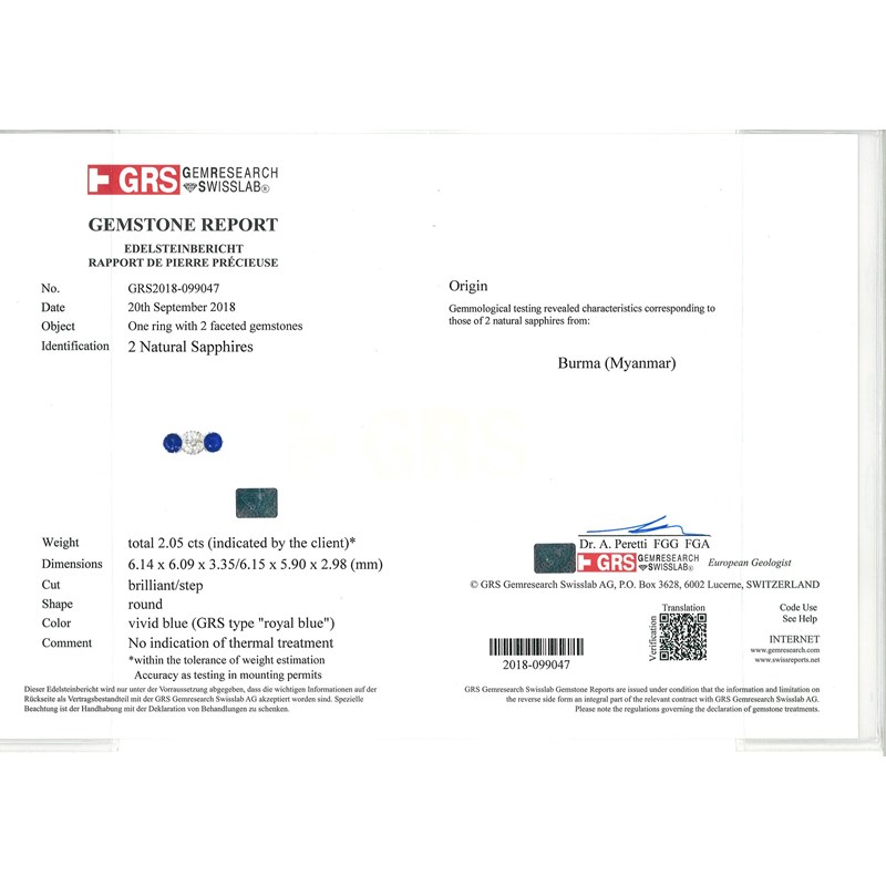 Accompanied by report number GRS2018-099047 dated 20th September 2018 from GRS, Switzerland stating that the two natural sapphires weigh 2.05cts total (as stated by the client) and are natural sapphires with 'royal blue' colour and no indication of thermal treatment. Origin: Burma