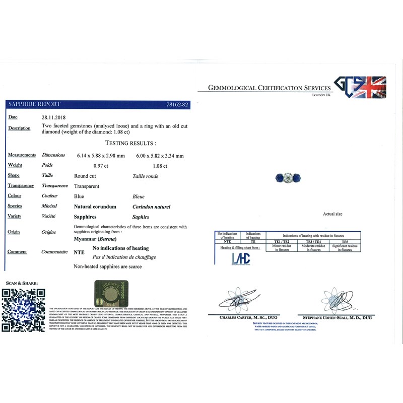 Accompanied by report number 78162-82 dated 28 November 2018 from GCS, London stating that the two round-cut sapphires weigh 0.97 and 1.08cts and are natural sapphires with no indications of heat treatment. Origin: Burma