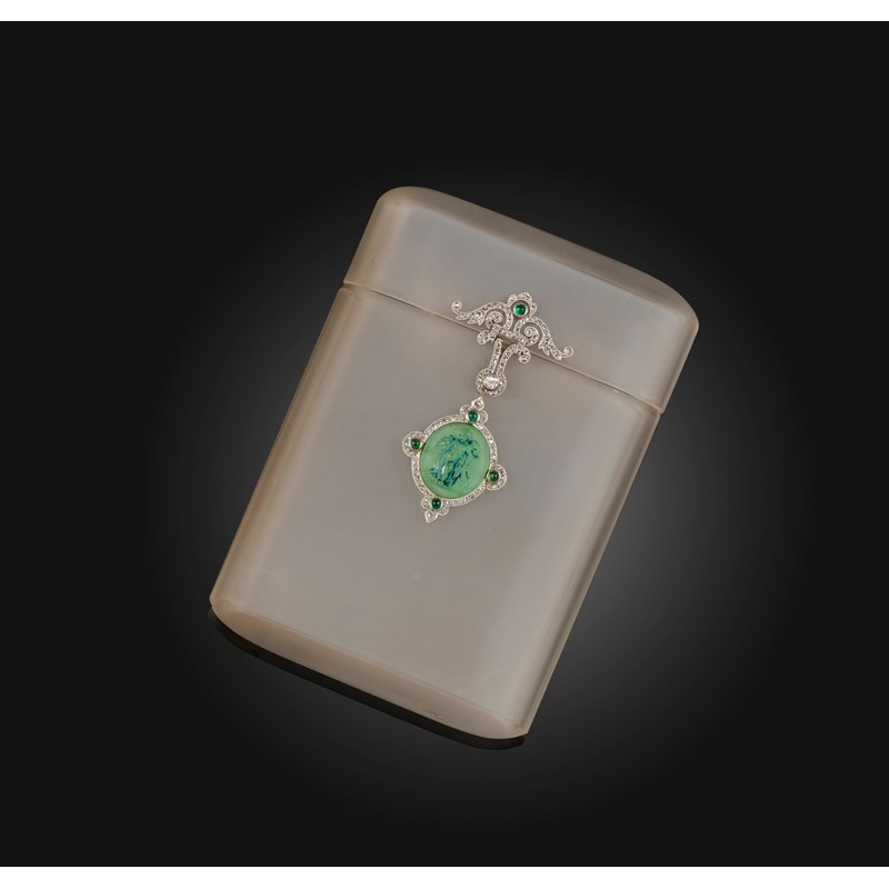 An Art Deco emerald, diamond and rock crystal cigarette case, circa 1915, the rectangular case with a hinged lid in frosted rock crystal, applied with a green glass cameo of Cupid within a border of rose-cut diamonds and cabochon emeralds, the clasp and hinges similarly set with rose-cut diamonds, one cabochon emerald and one circular-cut diamond, mounted in gold and platinum, measuring 8.0 x 5.4 x 1.8cm