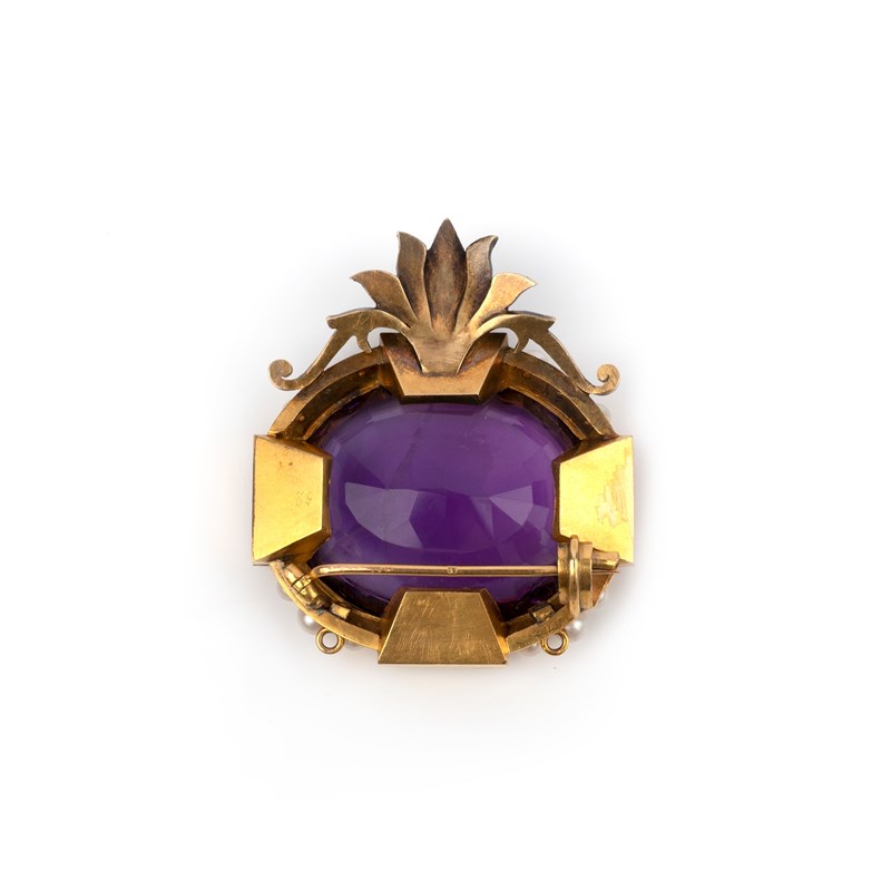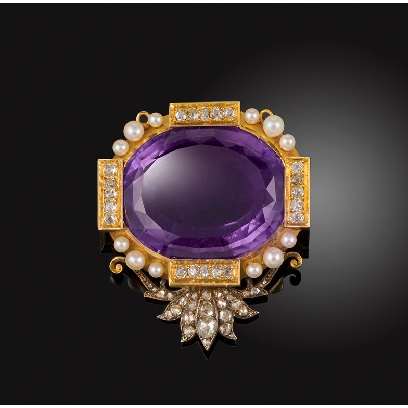 An amethyst and diamond brooch, second half 19th century, set with a large oval amethyst, bordered with panels of cushion-shaped diamonds spaced by pearls, above a palmette set with rose-cut diamonds, mounted in gold and silver, measuring 4.9 x 4.2cm, French import assay mark for 18ct gold, pearls untested