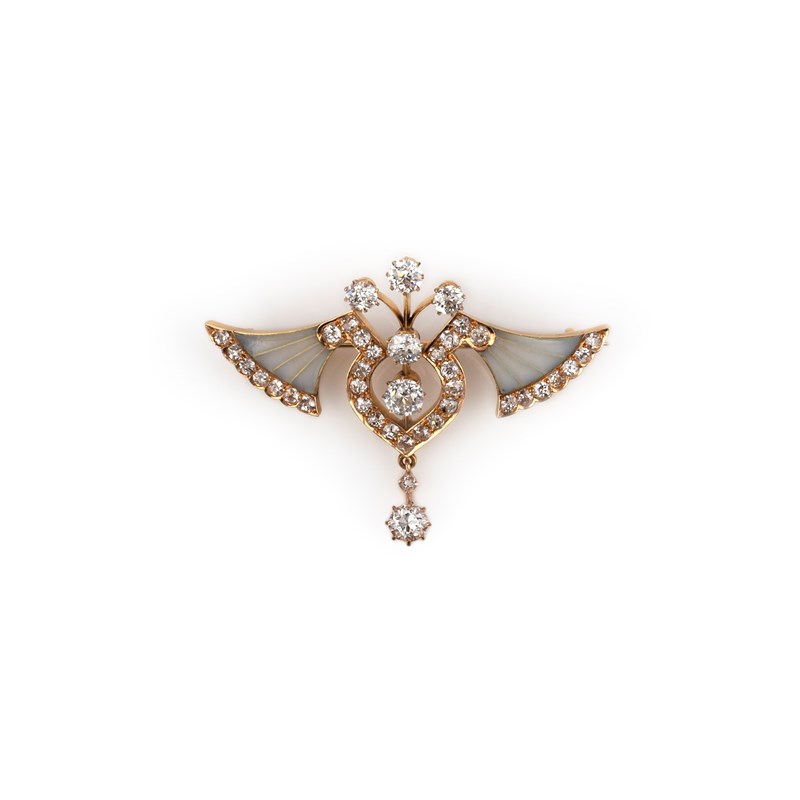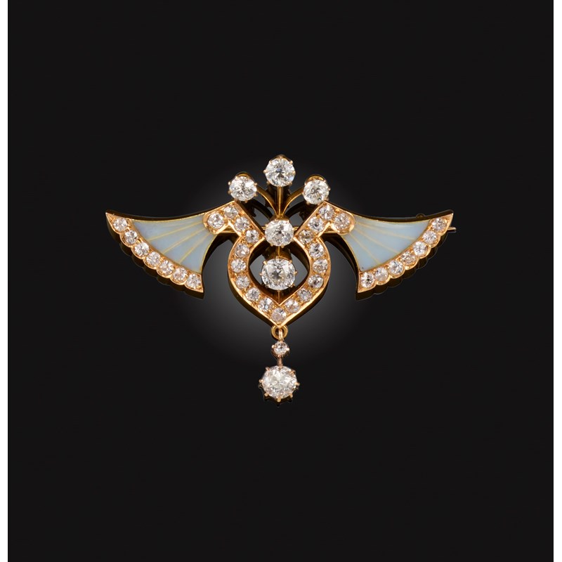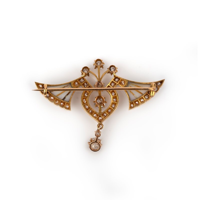An Art Nouveau diamond and enamel brooch, circa 1900, of abstract foliate design, with flared motifs