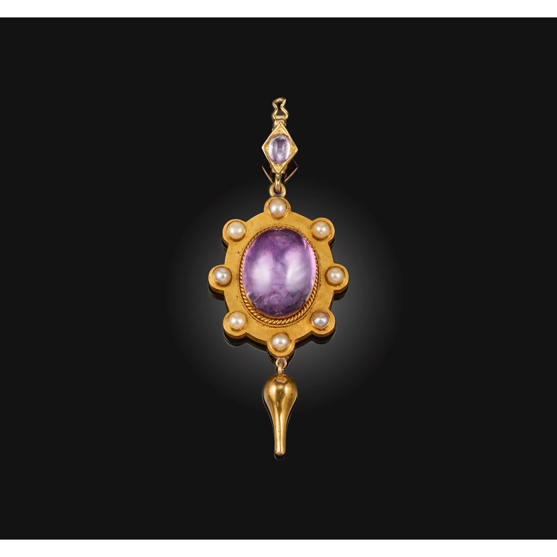 A Victorian amethyst and half pearl locket pendant, mid 19th century, centring on a cabochon amethyst in a foiled setting, within a gold mount applied with rope twist decoration and set with half-pearls, the reverse with a glazed locket compartment, suspending a gold drop pendant, surmounted by a bail set with a foiled amethyst, length 6.6cm, drop pendant possibly later added, pearls untested