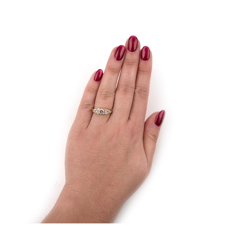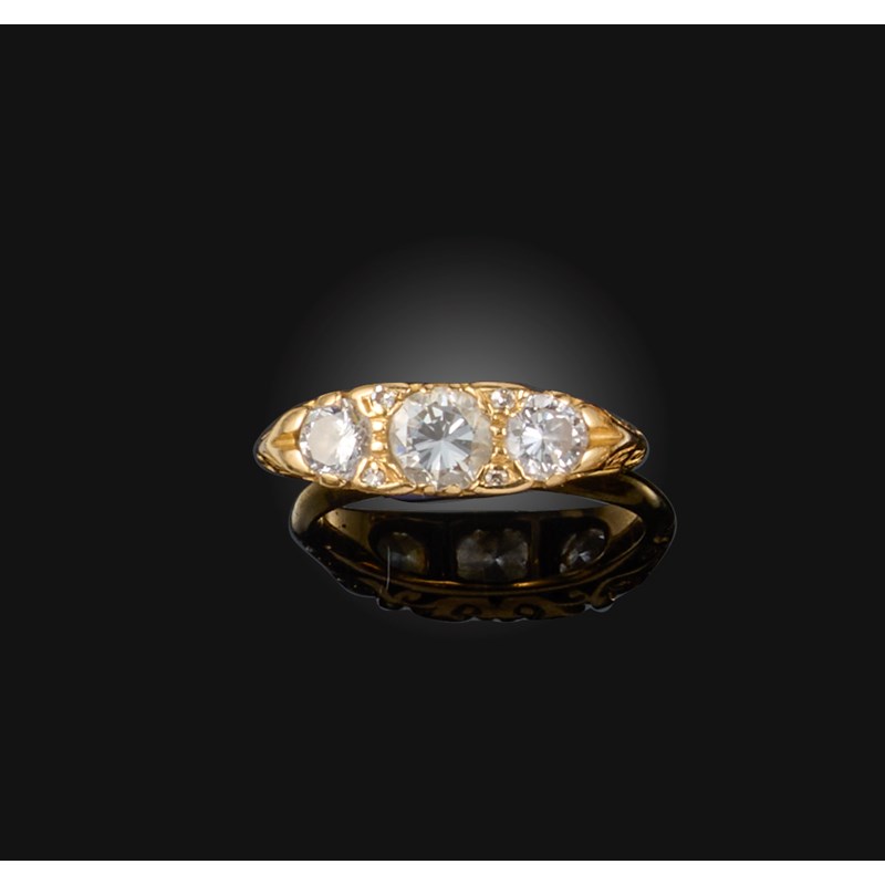No reserve - A diamond ring, of half-hoop design, set with three brilliant-cut diamonds totalling approximately 0.80 carats, spaced by smaller single-cut diamonds, to a scrolled mount in yellow gold, size L