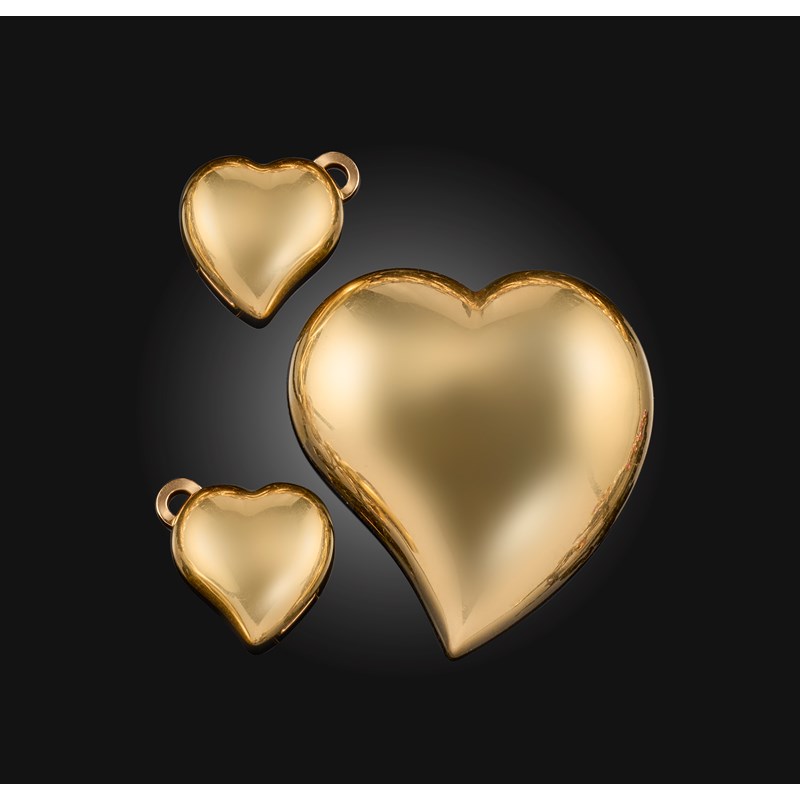 A gold demi-parure, comprising: a brooch and pair of ear clips, each designed as a witches' heart in polished gold, brooch measuring 5.9 x 5.5cm, length of ear clips 2.5cm, each stamped 14K, combined gross weight 44 grams
