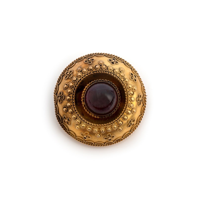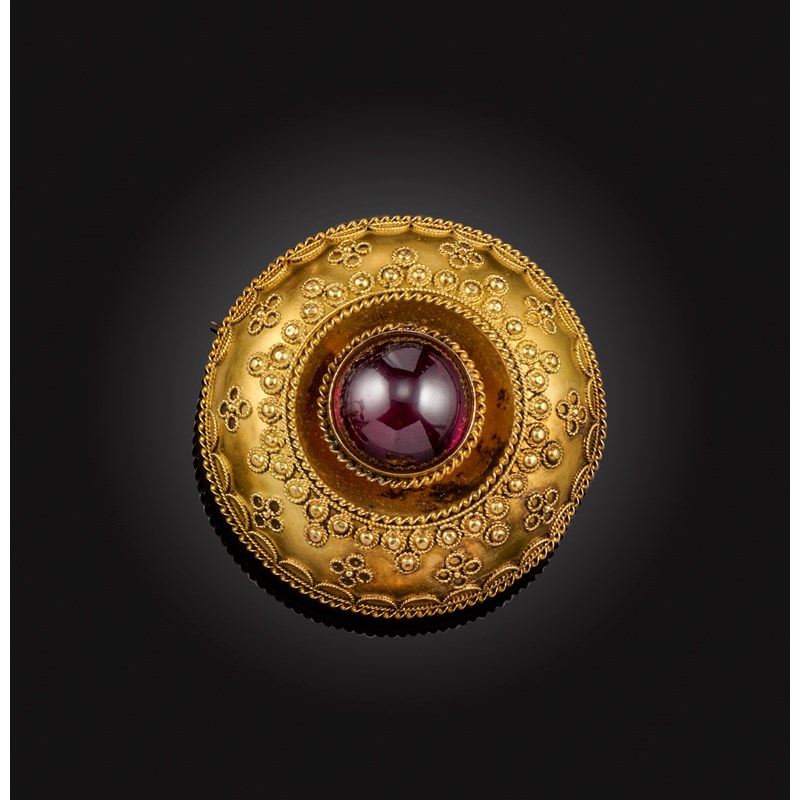 A gold and garnet brooch, mid 19th century, centring on a cabochon almandine garnet in a foil-backed setting, within a circular gold brooch designed in the Archaeological Revival style, applied with gold rope twist and grainti decoration, the reverse with a glazed locket compartment, diameter 3.7cm