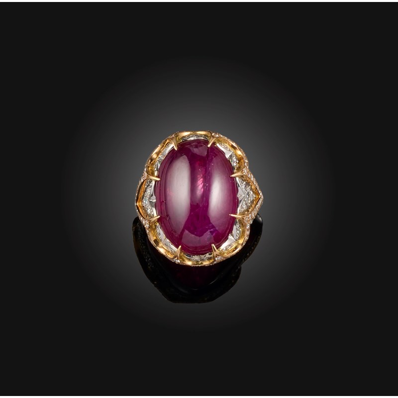 A ruby and diamond ring, claw-set with a cabochon ruby weighing approximately 16.00 carats, to a