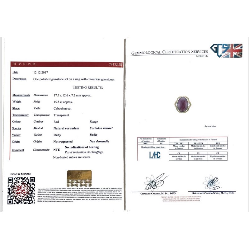 Accompanied by a facsimile copy of report number 78132-58 from GCS dated 12th December 2017 stating that the ruby shows no indications of heat treatment