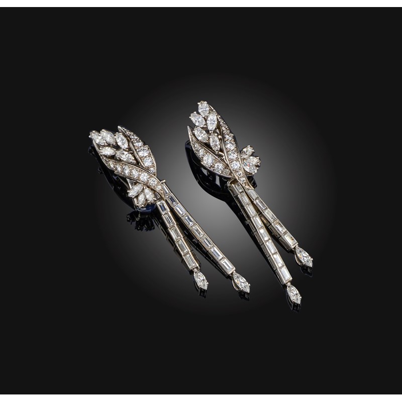 A pair of diamond 'day and night' earrings, mid 20th century, each designed as a foliate surmount set with brilliant-cut and marquise-shaped diamonds, suspending a detachable tassel of baguette and marquise-shaped diamonds, total length 6cm each, clip and post fittings, French assay marks for 18ct gold