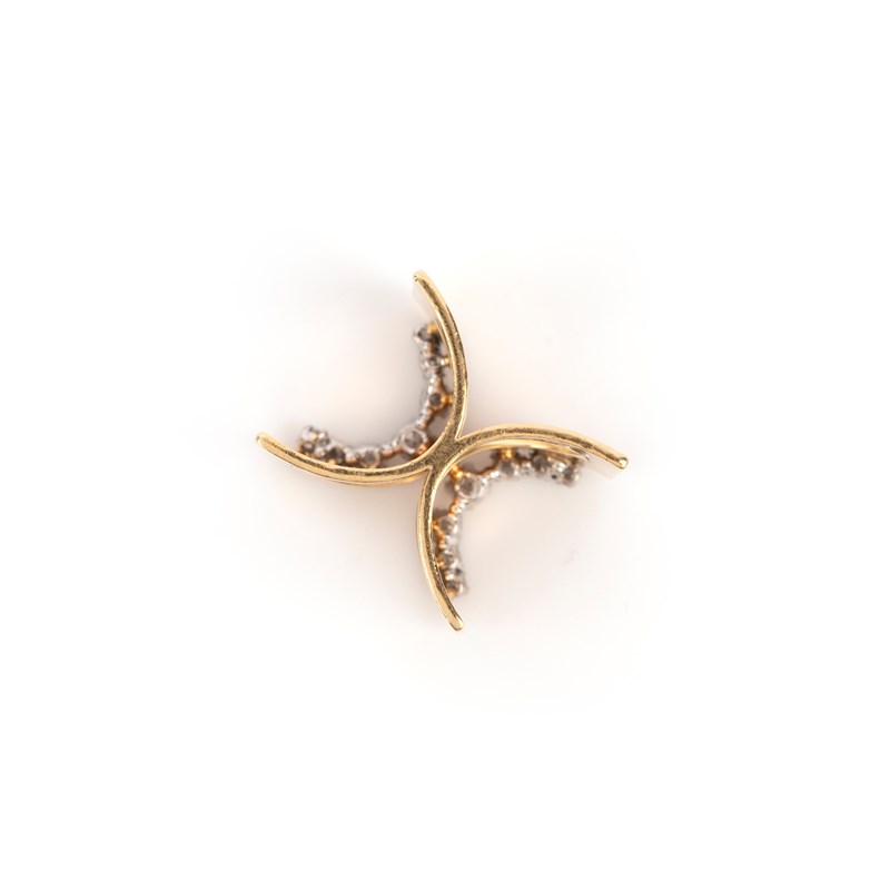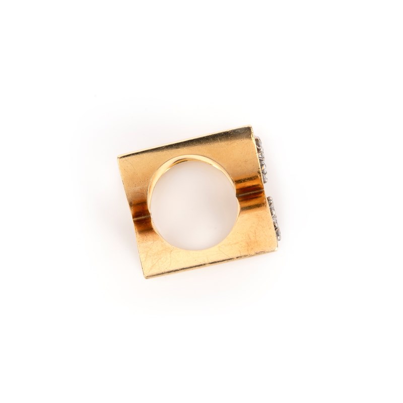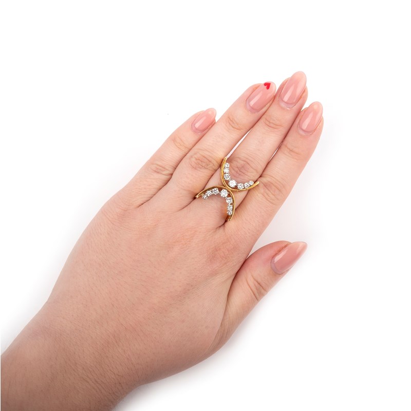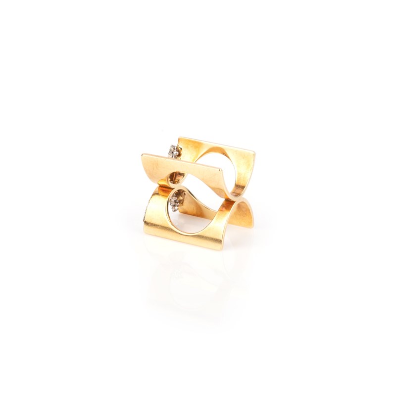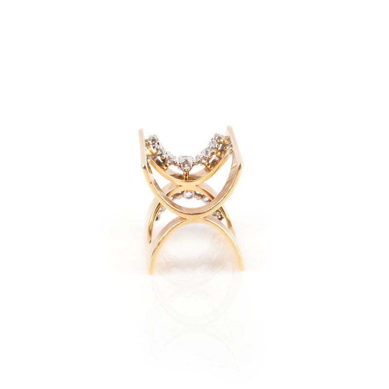 Φ Gilian Packard, a diamond ring of sculptural design, the connecting arcs each set with graduated round brilliant-cut diamonds in 18ct yellow gold, maker's mark GEP and London hallmarks for 1972, approximate ring size J