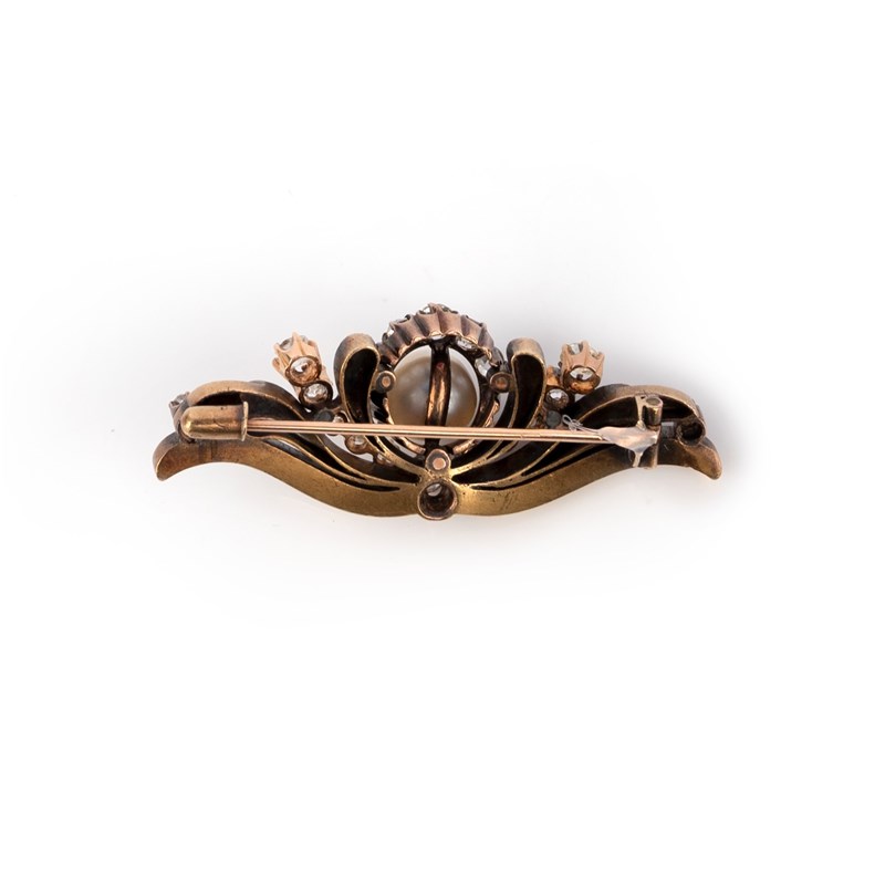 A pearl and diamond brooch, late 19th century, centring on a pearl measuring approximately 8.0 x 8.8 x 7.6mm, to a mount of scrolled design set with cushion-shaped and rose-cut diamonds, mounted in gold and silver, length 5.1cm, pearl untested