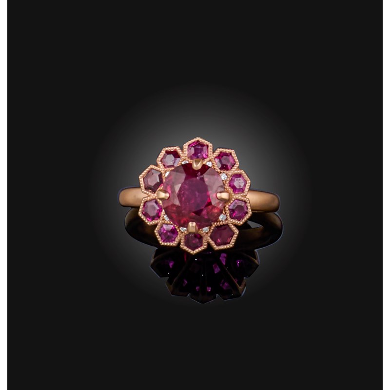 A ruby ring, of cluster design, centring on a cushion-shaped ruby weighing approximately 3.80 carats, within a floral border of hexagonal rubies, in a millegrain-edged gold setting, size N