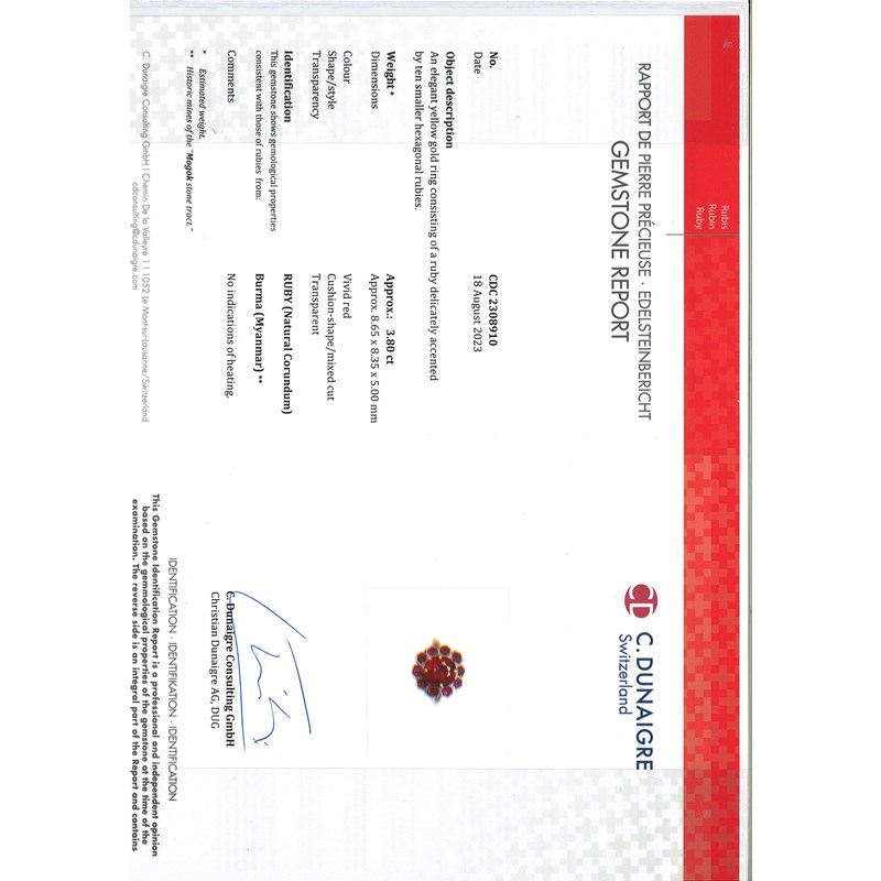 Accompanied by report number CDC 2308910 dated August 18, 2023 from C.Dunaigre Switzerland, stating that the central cushion-shaped ruby weighing approximately 3.80carats is of Burmese (Myanmar) origin, with no indications of heat treatment