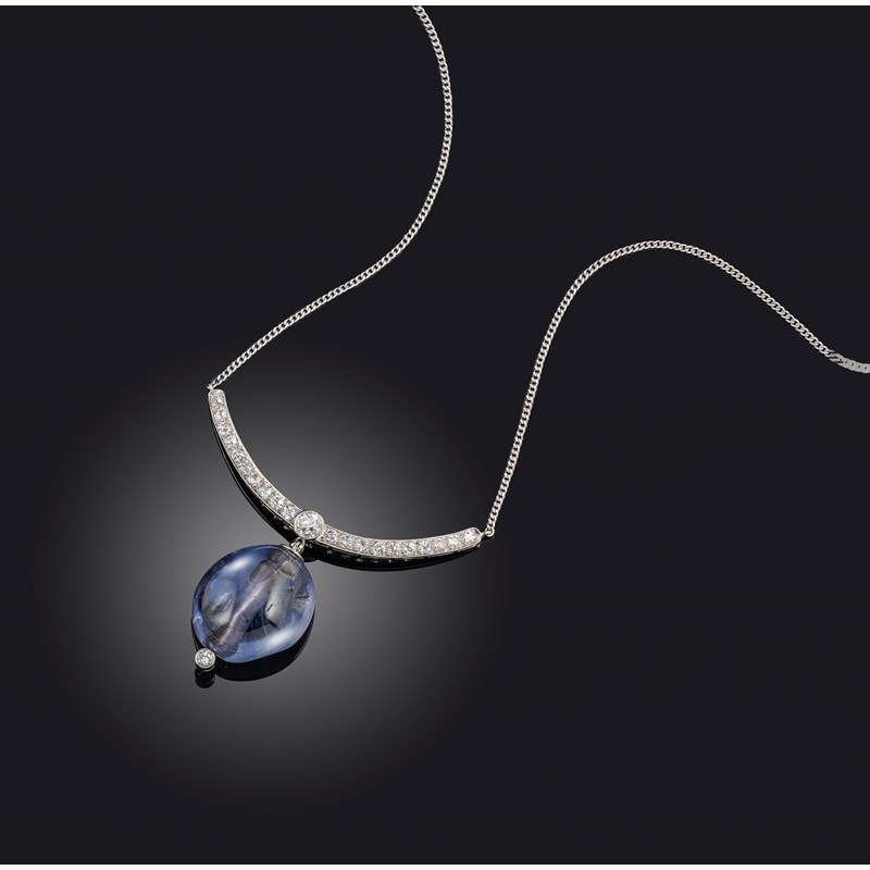 A sapphire and diamond necklace, the front composed of a curved line of brilliant-cut diamonds