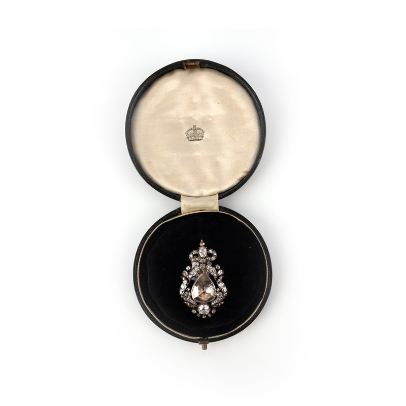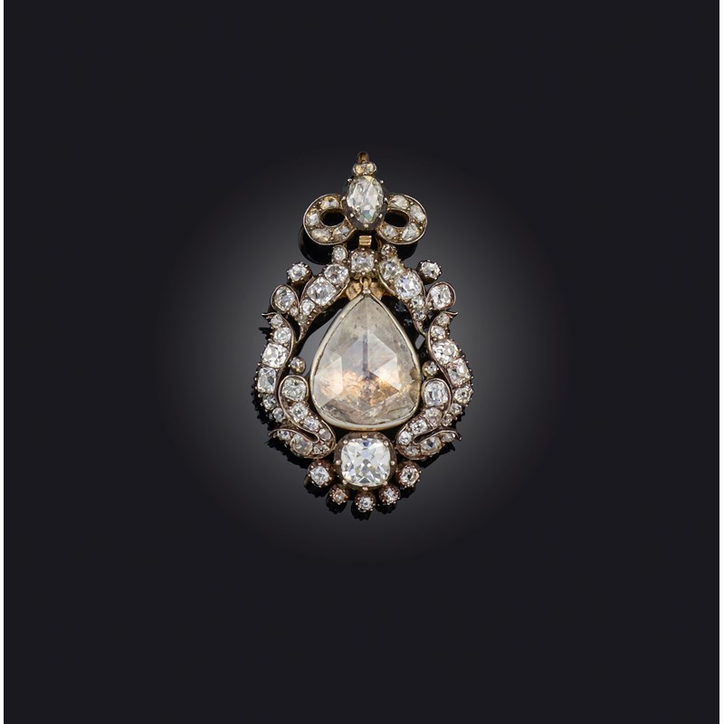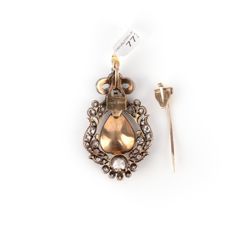 A diamond pendant/brooch, early 19th century and later, designed as a foliate frame set with cushion-shaped diamond, the centre suspending a pear-shaped rose-cut diamond in a foiled setting, length 4.7cm, rose diamond possibly later added, top section with pendant loop interchangeable with a plain gold brooch fitting, fitted case