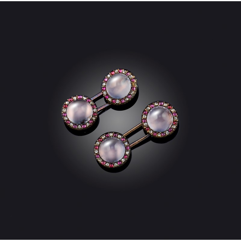 A pair of chalcedony, ruby and diamond cufflinks, late 19th century, each end of circular outline, set with a cabochon chalcedony in a reflective closed-back setting, within a border of rose-cut diamonds and cabochon rubies, ends 1.0cm diameter each, case stamped Goldsmiths & Silversmiths Company