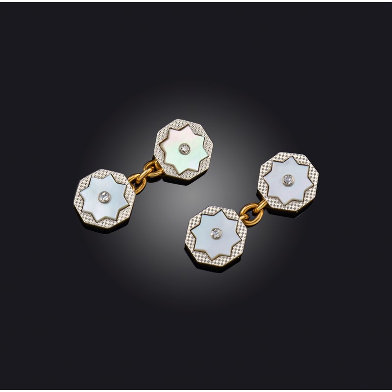 A pair of mother of pearl and diamond cufflinks, early 20th century, each end of octagonal outline, centring on a star motif in mother of pearl set with a single-cut diamond, connected by chain, each end 1.2cm diameter, stamped PT&18CT